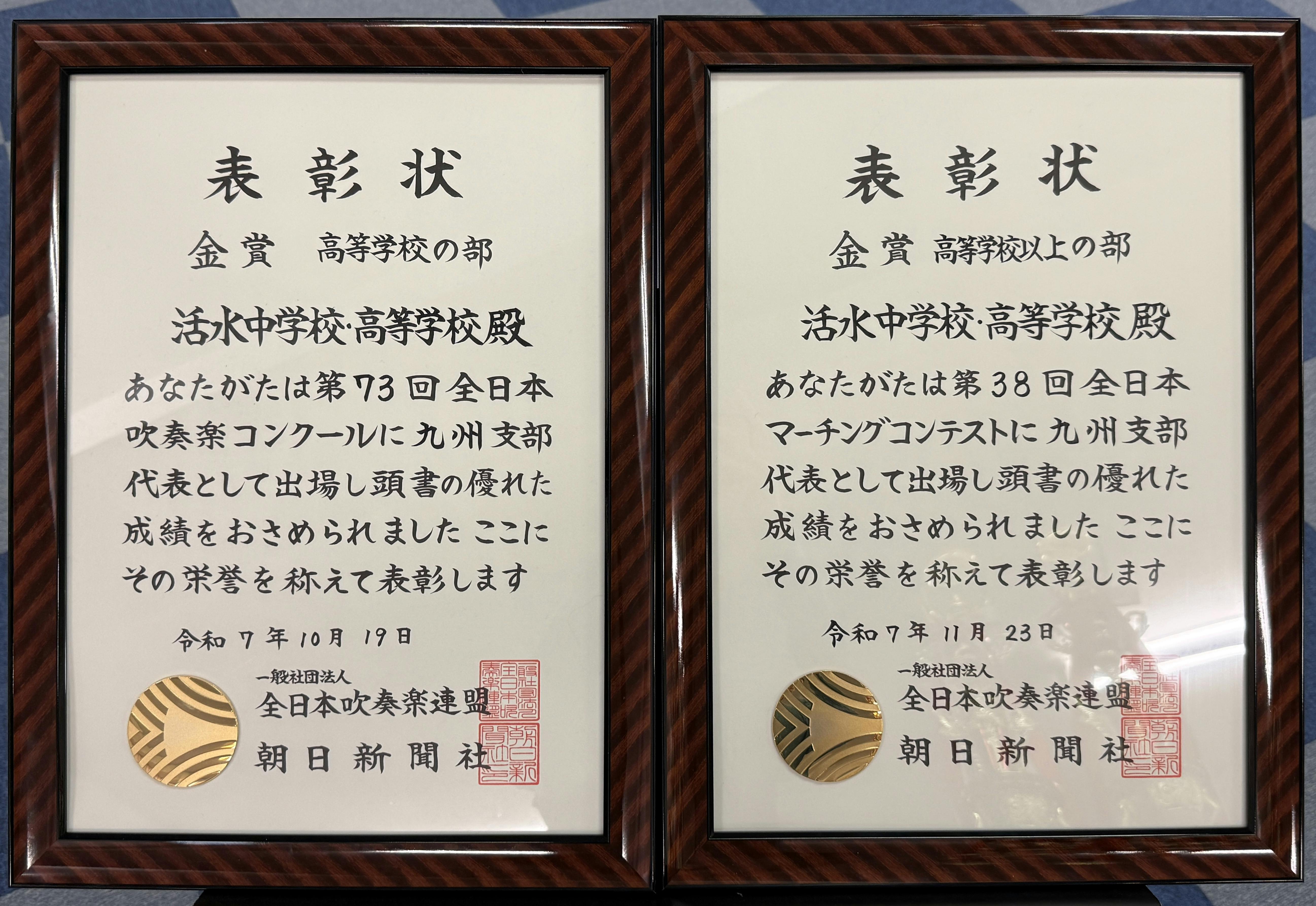 2025/12/23 15:00第73回全日本吹奏楽コンクール・第38回全日本マーチングコンテストW(ダブル)金賞受賞インタビュー全日本吹奏楽コンクール 大会の台裏 ― 部員52名でつかんだ栄光 ―全国大会出場校の多くは百人規模の部員を抱え、厳しいオーディションを経て選抜される。しかし、活水はわずか52名。中学生5名、初心者3名を含む編成だ。楽譜を読むところから始めた部員も舞台に立ち、全員で音を作り上げた。「初心者が全国の舞台に立てるなんて、他校ではありえないこと。だからこそ誇れると思います」と彼女たちは胸を張る。「最初は不安ばかりでした。本当に全国大会に行けるのかどうかも分からないくらいで…」 九州大会では満足のいく演奏ができず、その悔しさをバネに全国へ挑んだ。そこから練習の空気は一変した。「九州大会後、しだいに、みんなの息が合ってきたんです」吹奏楽部Ⅲ年生副部長の一瀬さんと音楽リーダーの堤さんにお話をきいた。左:Ⅲ年吹奏楽部副部長 一瀬さん右:Ⅲ年音楽リーダー 堤さん「自分たちの“音”を作り上げる」― 吹奏楽部の挑戦 ―全国大会金賞受賞の裏には「自分たちの曲を作り上げる」という地道な積み重ねがあった。 セクションごとの少人数練習では、一音一音に徹底的にこだわり、美しい演奏を目指した。さらに、10分・15分刻みで練習計画を立て、同じメロディーを担当するメンバー同士で音を合わせる。誰とどこを合わせるのかを細かく決めて取り組んだ。「本当に細かい作業の繰り返しでした」課題曲を一人ずつ全員の前で演奏する試みも行った。少人数だからこそ、一人ひとりの技術が全体の完成度に直結する。緊張の中で披露し合うことで、個々の力を磨き、全体の響きを高めていった。今年のチームにはもう一つの特徴があった。学年を超えた意見交換だ。 「Ⅲ年生が指示して行うこともありますが、下級生にも『どう思う?』と問いかけ、学年に区別なく意見を言い合えた。それが強みになったと思います」演奏を作り上げる過程では、曲の雰囲気やイメージをめぐっての議論も重ねられた。自由曲の中間部 ― ゆったりとした場面―では「切なく」、「希望をもって」など様々な意見が飛び交い、なかなかまとまらなかった。最終的に杉町先生が示した「チャペルで祈りを捧げるイメージ」という言葉に全員が共感し、方向性が定まった。音楽を「作り上げる」とは、こうして一つのイメージを共有し、全員で響きを形にしていくことなのだ。全国の演奏を聴き比べると、学校ごとに個性がある。力強さを前面に出すバンドもあれば、繊細で上品な響きを追求するバンドもある。活水は女子校であり、指揮者も女性という、全国大会出場校で唯一の存在。その特性を生かし、「上品さ」「女性らしさ」を音で表現することを目標に掲げた。 「全国大会で、審査員の講評に『上品で、しなやかなサウンド』と書いていただけたんです。自分たちが目指した音を、審査員に伝えることができたのが本当に嬉しかったです」自分たちの理想の音を決め、仲間とともに磨き上げた響き。それが全国大会の舞台で評価され、金賞という最高の形で実を結んだ。 ――「これ以上ないぐらいの喜びでした」「最後の演奏は本当に楽しかった」― 一体感が生んだ全国金賞 ―全国大会当日の朝には、Ⅲ年生がホテルの一室に集まり、15分ほど“気合い入れ”を行った。「当日の流れを確認して、“最後までⅢ年生が引っ張って必ず良い演奏をしよう”と全員で意思を確かめました」短い時間ながらも、イメージの統一と気持ちの結束が、舞台での演奏に大きな力を与えた。全国大会本番は、九州大会までとは違う気持ちで演奏ができた。 「全国はもう“いける、いける、いける”っていう期待を込めて演奏できました。本番の勢いと先生とも一緒になれた感じがして、決めどころを全員で共有していたので、審査員にしっかり届けようという気持ちで演奏できました」その結果、演奏中に自然と一体感が生まれた。九州大会までは感じられなかった「心が一つになる瞬間」が、全国の舞台では確かにあったのだ。 「最後の演奏は本当に楽しかったです」「楽しかった」その言葉が繰り返されるほど、彼女たちは音楽を心から楽しみ、その楽しさが聴衆にも伝わった。 「九州大会までは、何としても全国に行きたいと思っていました。でも、全国大会に向けては“絶対金賞”って思っていました。失うものはない、やるだけでしたから」プレッシャーに押しつぶされそうだった九州大会を乗り越え、全国の舞台で全力で楽しみ、仲間と一体となった演奏。その瞬間が、金賞という最高の結果を引き寄せた。 ――「音楽って不思議。楽しんでいるからこそ、聴いている人にも伝わるんです」「場数と感謝が力になる」― 全国金賞の舞台裏 ―全国大会直前であっても、活水吹奏楽部は数々のイベントに出演した。外から見れば「大変ではないか」と思えるが、彼女たちにとってはそれが日