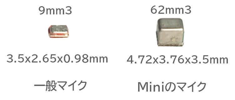 左側に置いたスピーカから音楽(ポップス)を流しています。スピーカーもminiも多少置く位置が異なりますが、ほぼ同じ条件、同じフレーズのところで撮影しました。壁に反射した音なので正確ではありませんが、これが内蔵マイクと中音拡張マイクとの性能差の一例になります。
