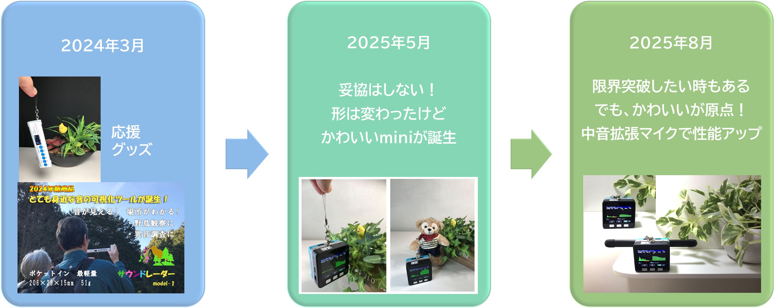 音の場所を可視化してカメラ画像に色で表示する音響カメラは、数社から販売されていますが、どれも大きくて重く、とても高価です。Sシステムラボは、2024年3月これらの市販装置と比べても劣らない性能を持ちながら、小型、軽量、価格1/10で音の場所をリアルタイムで表示する「サウンドレーダー model-1」をCAMPFIREで先行販売しました。そして、このときに合わせて追加販売した応援グッズがとてもかわいらしく見えて実際に動かしてみたくなりました。でも本当に動かせるのか?使い物になるのか?この商品に見合う価格は?毎日「自問自答」していました。これからどのような展開が待っているのか「開発日記」に残すことにしました。実用性重視で価格と性能の限界に挑戦した「サウンドレーダーmini」。安くてかわいいのに本格志向。その実力は侮れませんよ。