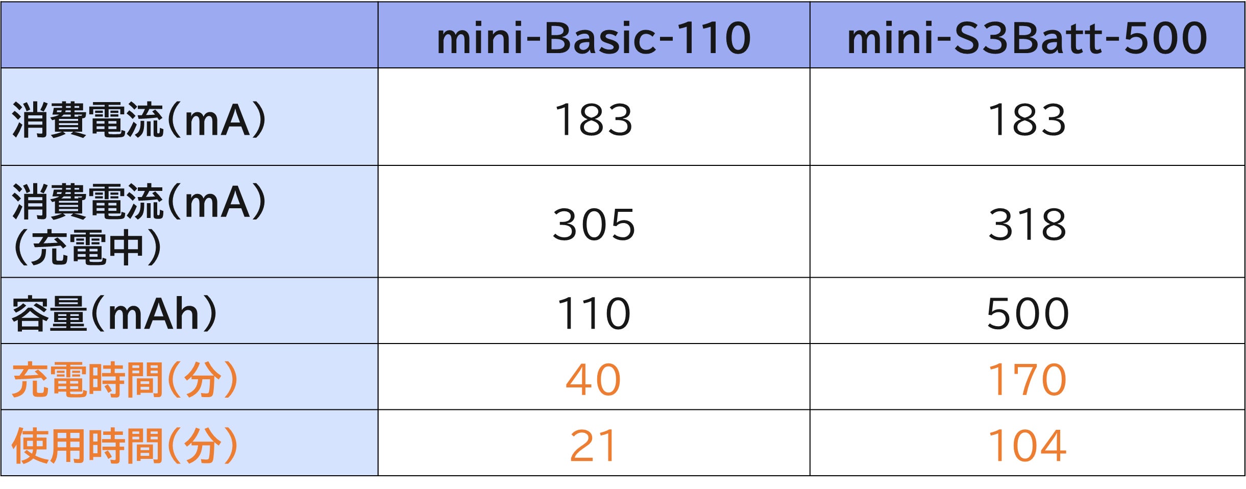 A.写真のバッテリー(4500mAh、92g)は直結できてグリップにもなるので、お気に入りの1つです。使用時間はmini-S3Batt-500より9倍も長い15時間も使え、使いながら内蔵バッテリーの充電ができます。