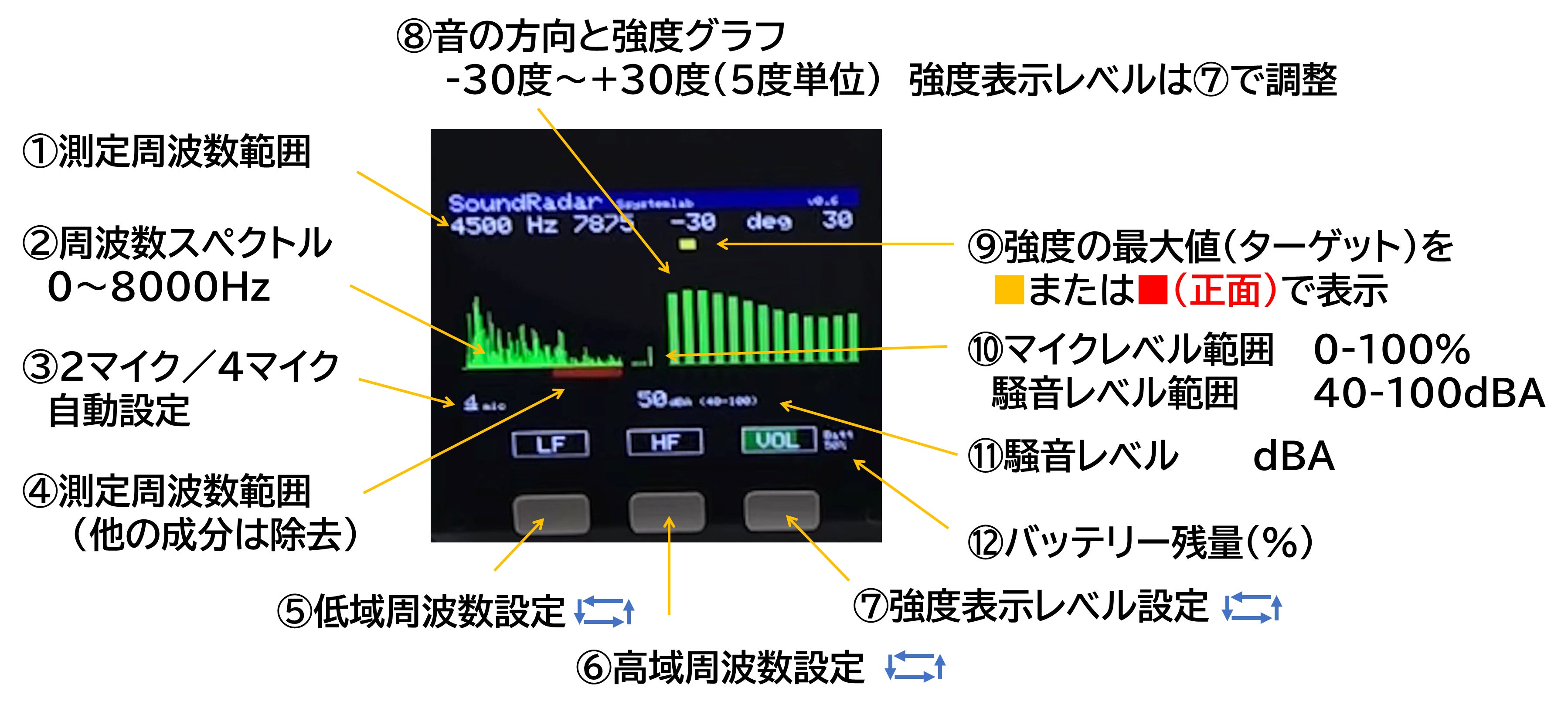 1.②周波数スペクトルで音の成分を確認し、⑤⑥周波数設定と⑦強度表示レベル設定で音の抽出条件を設定します。ボタンを押す度に設定が変更され、再び元に戻ります