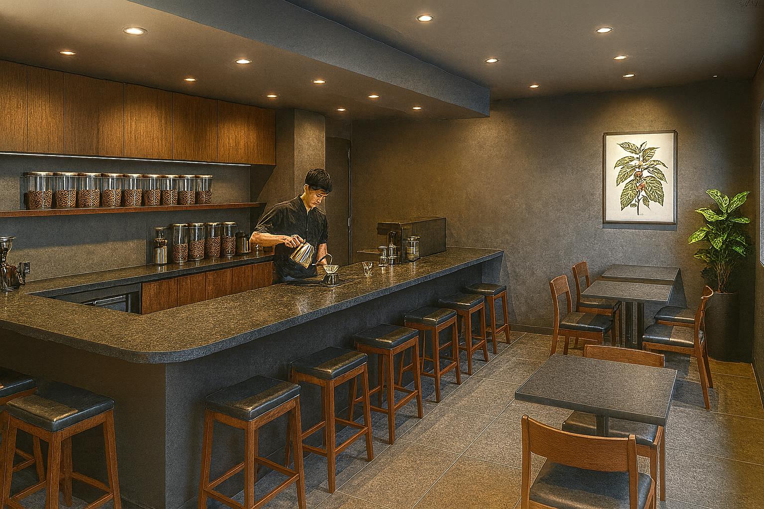 - カウンターを中心に、抽出の所作を“舞台のように”見せる配置
