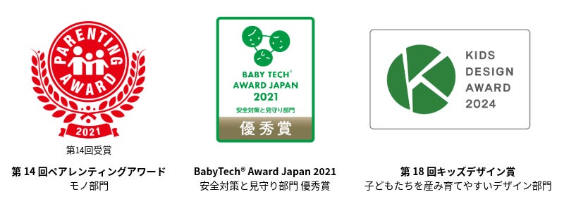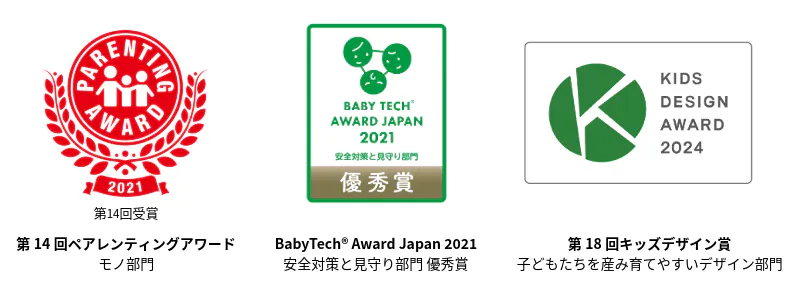 第9回健康寿命をのばそう︕アワード<母子保健分野> 厚生労働省子ども家庭局長賞 企業部門優良賞、第2回日本子育て支援大賞、ペアレンティングアワード、BabyTech® Award、キッズデザイン賞など、数々の賞もいただき、社会的な信頼を重ねてきました。