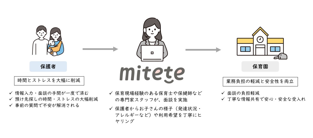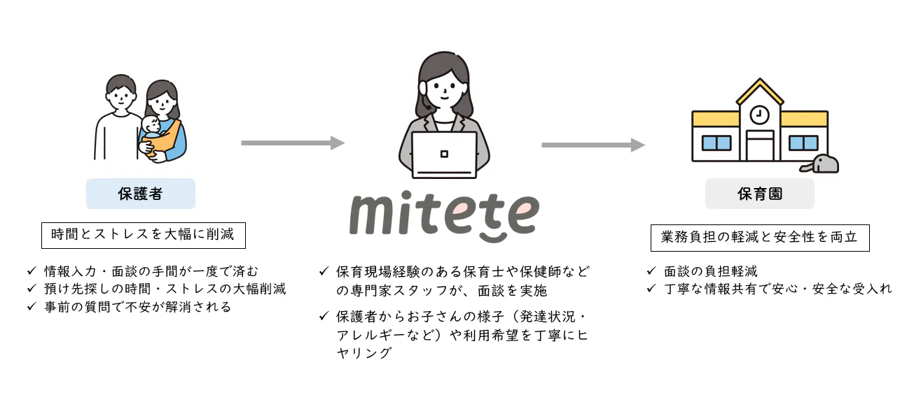 miteteは、保育園探しの先にある“悩み”や“想い”にも寄り添い、必要な支援へ導く“子育て支援のナビゲーター”として生まれ変わります。