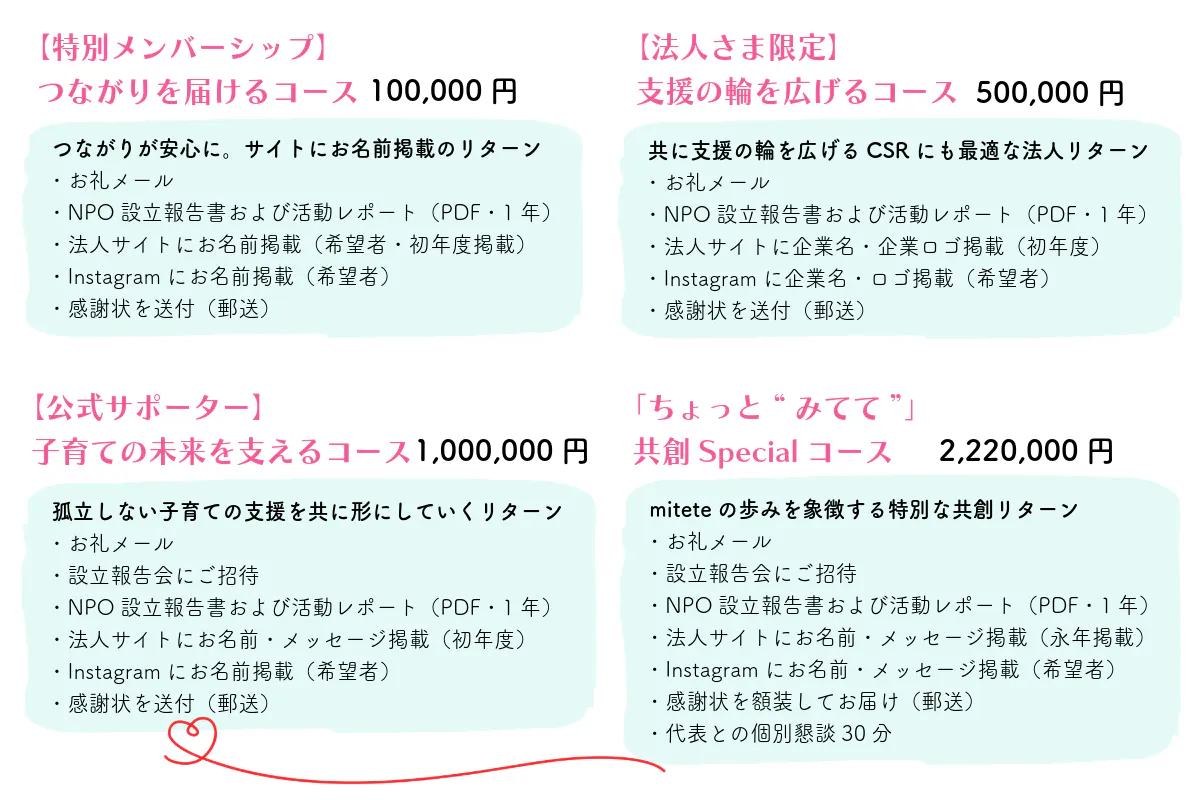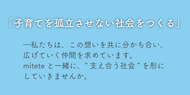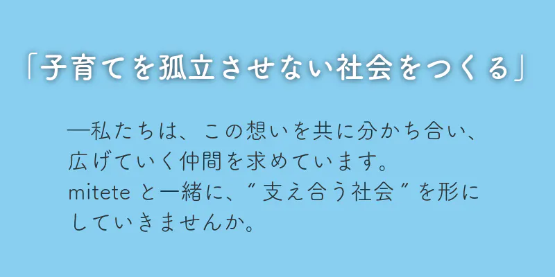 NPOとして活動することで、企業の枠にとらわれず、より多くの支援サービスと連携できるようになります。 miteteは、子育てを社会全体で支える「共助の輪」を、その中心で形にしていきます。