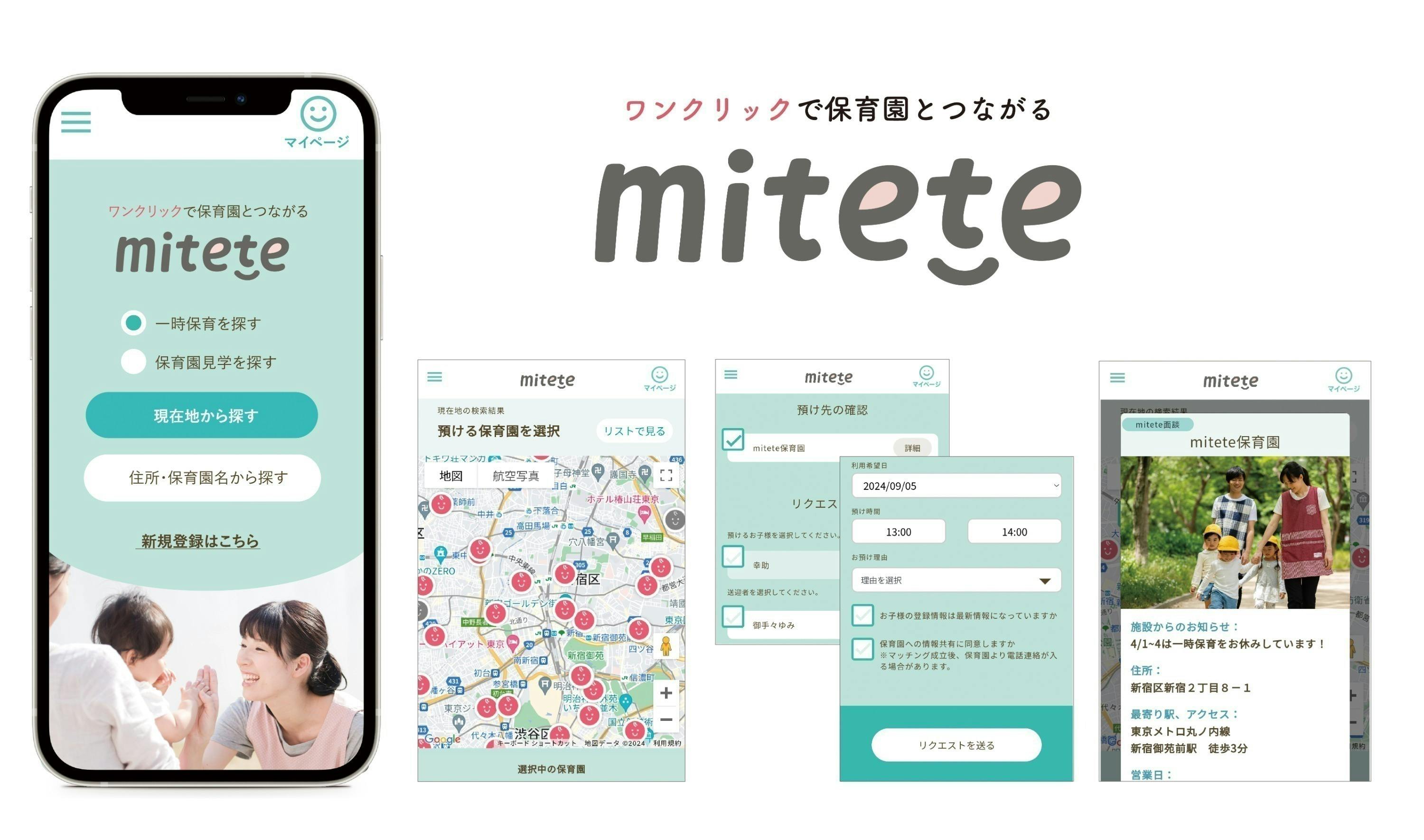 miteteは、一時保育の登録・面談から予約までがスマートフォン1つでできるwebサービスです。各施設で必要な登録書類も、施設での面談も、利用予約もすべてオンラインで完結。※書類や面談が別途必要な施設もあります。