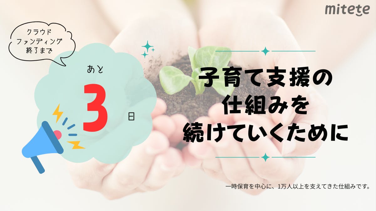 2025/12/15 10:18いよいよ、ラストスパートです。ご支援いただいた皆さま、ありがとうございます。厳しい挑戦となっていますが、ここからだと思っています!私たちは、一時保育を利用したい保護者と保育園をつないできました。また、他にはないオンライン面談で、私たち自身が、保護者の声を聞き、状況を見てきたからこそ、一時保育だけでない、必要な支援につながる仕組みを強化していきたいと思っています。応援ありがとうございます!実際に使っていた保護者の方や、共感していただいた方々からのメッセージ、届いています。miteteは、だれかの「ちょっと“みてて”」を支えるサービスです。ラストスパート、是非皆さんのお力を貸してください! もっと見る