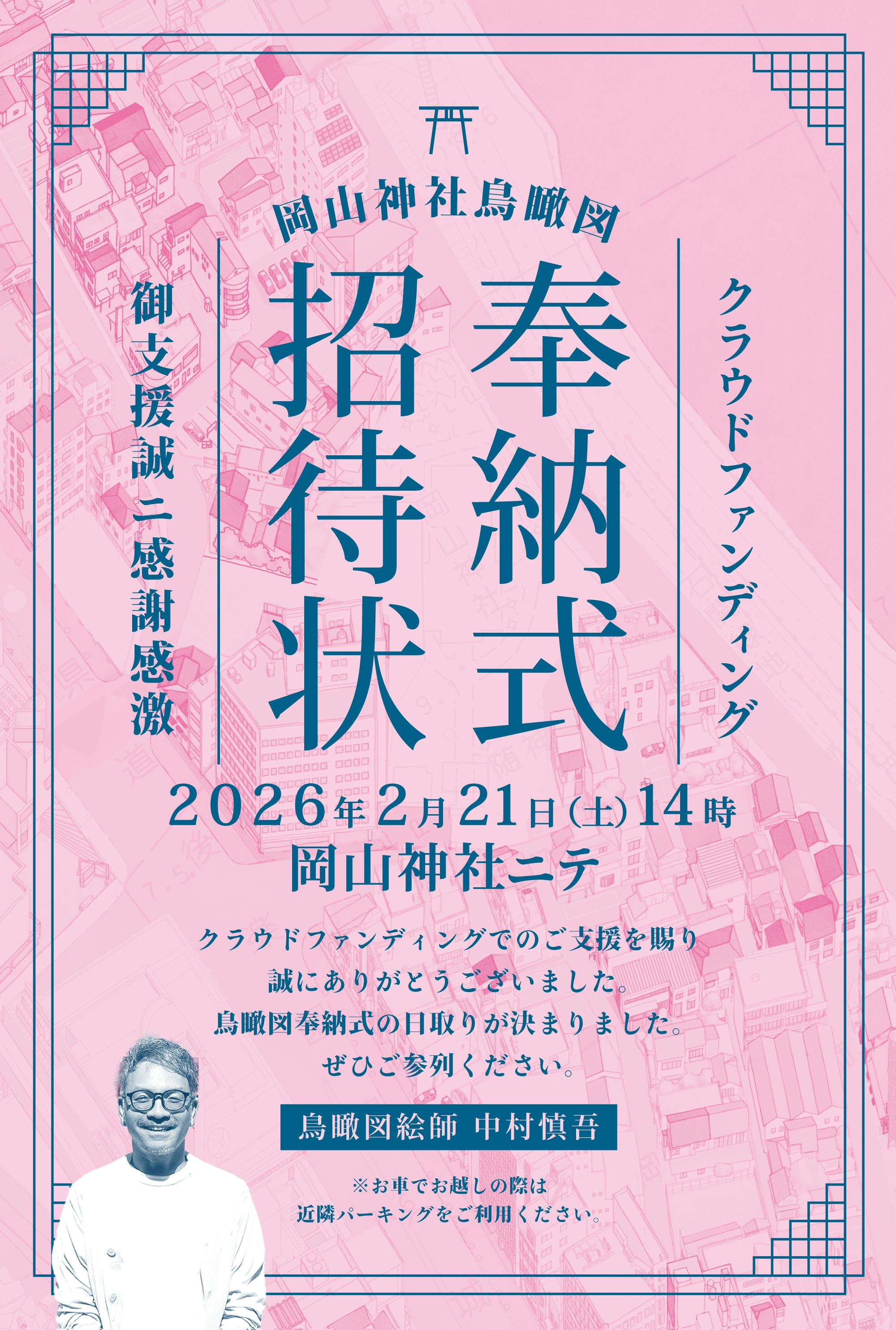 2026/01/10 13:52〜〜〜奉納式のお知らせ〜〜〜日時:2026年2月21日(土)14時〜場所:岡山神社(岡山市北区石関町2-33)どなたでも参列していただけます。※岡山神社には、公共交通機関でお越しになるか、近隣の駐車場をご利用ください。【式次第】14時00分 岡山神社拝殿前にお集まりください。 岡山神社にて鳥瞰図奉納の儀14時20分 鳥瞰図の除幕式 鳥瞰図絵師・中村慎吾の挨拶 岡山神社宮司・久山信太郎の挨拶14時30分 集合写真撮影(岡山神社拝殿前) 鳥瞰図絵師・中村慎吾の2026年・2027年の活動について・・・クラウドファンディングで奉納式の支援をしてくださった方へ・・・奉納式の招待状をお送りしております。内容をご確認の上、出欠のご連絡をお願いいたします。 もっと見る岡山神社・久山宮司からの応援コメント
