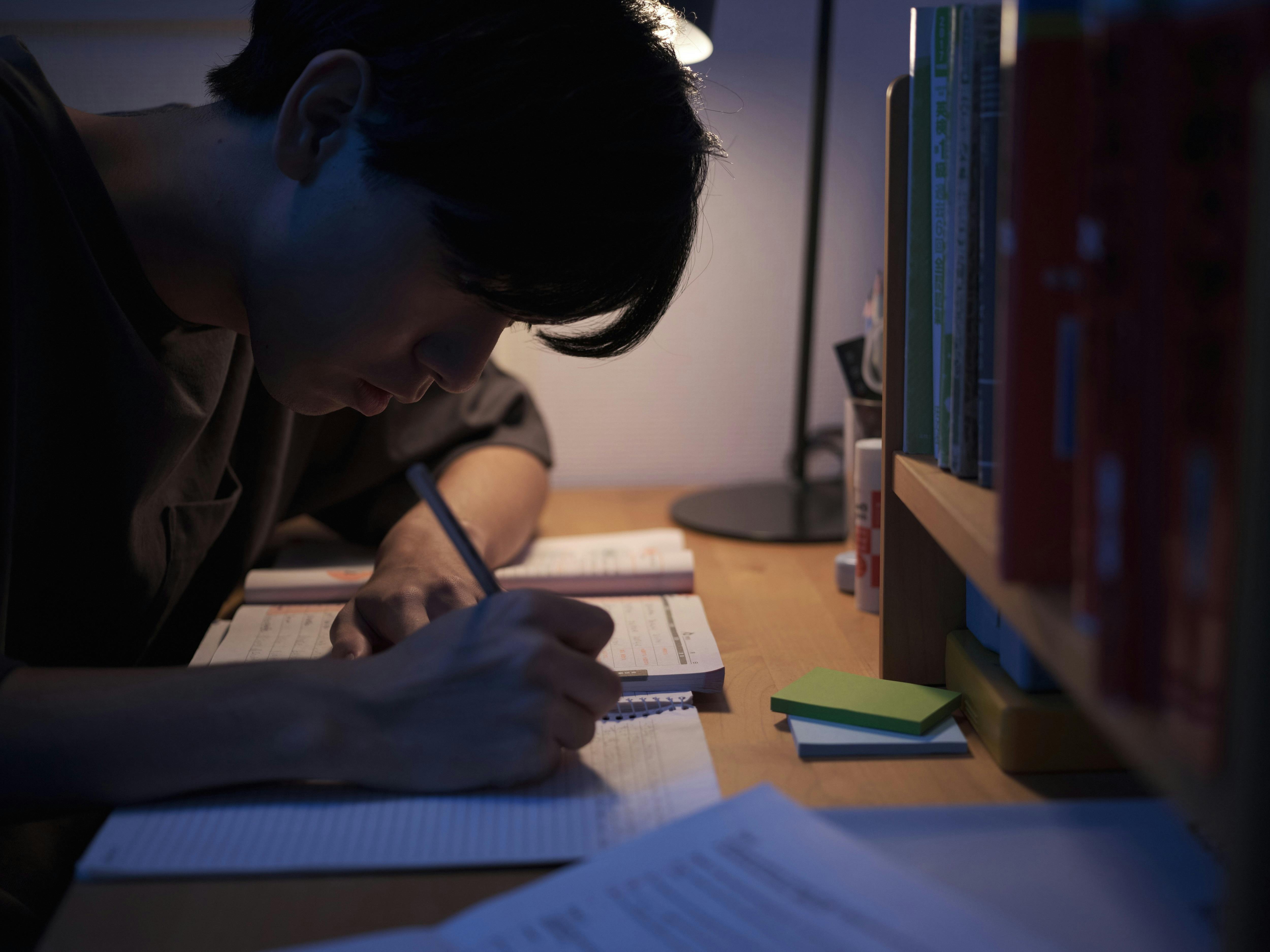 「受験生が、机で勉強しています。」