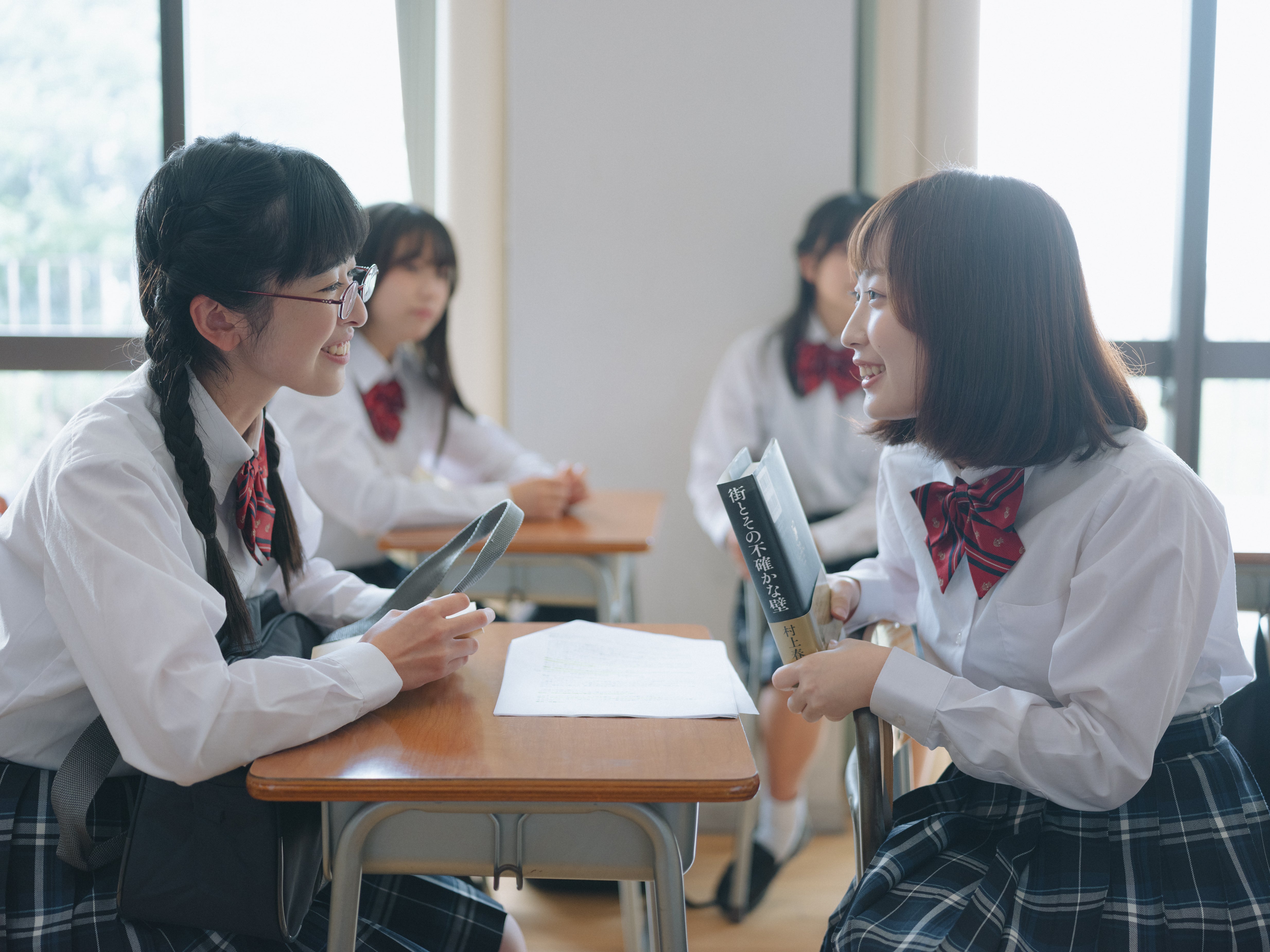 学校の中・・黒髪おさげでめがねの結衣と・・こちらも黒髪の、のぞみ・・。