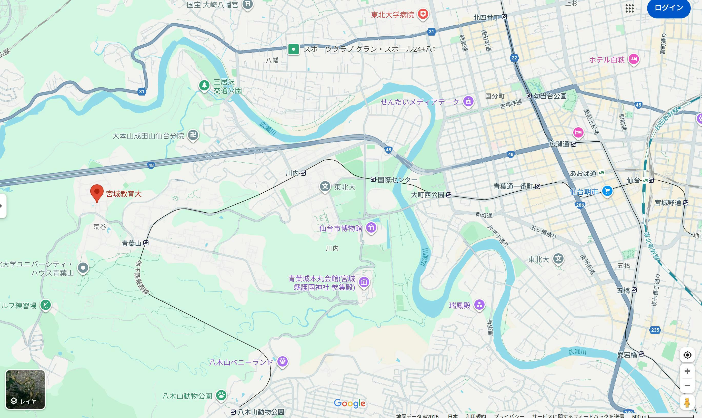 場所は上画像の通りです。最寄りは仙台市地下鉄東西線青葉山駅となります。そこから徒歩10分程度で大学に着くことができます。