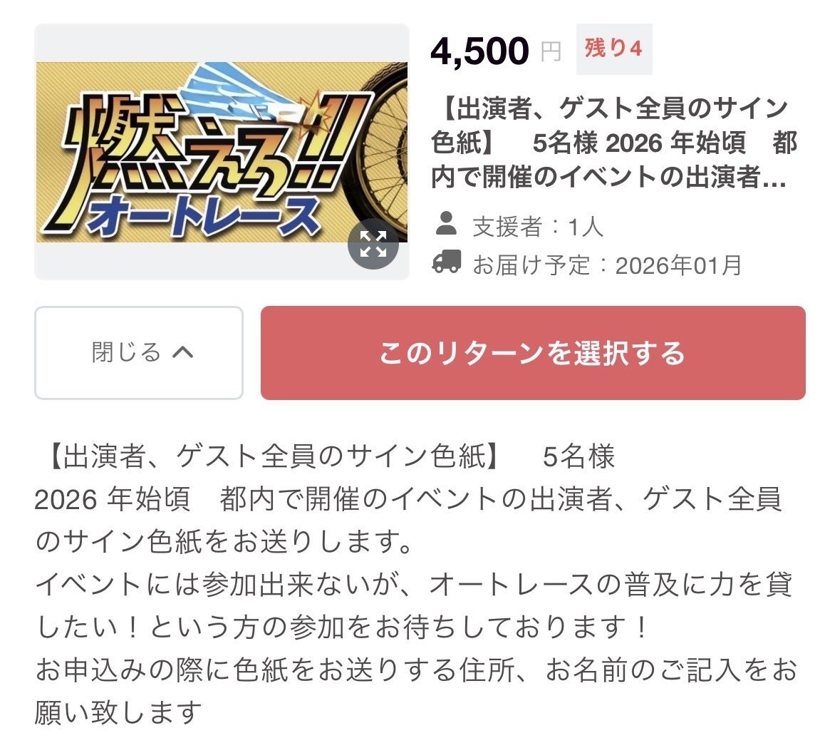 2025/11/20 18:01有難い事に、なんと売り切れたリターンがありましたので、追加のリターンを申請し、その申請が通りました。「出演者、ゲスト全員のサイン色紙」こちらが5名様分追加されましたので、ご報告致します。ご興味を持たれた方、是非ともご一考いただけたらと思います。そして、先月開始されたこのクラウドファンディングも、期日までいよいよ1週間となりました。開始当初から多くの方にお申し込みを頂き、「復活、イベント楽しみにしています!」というお声をたくさん頂きました。先日私が伊勢崎オートに伺った際にも、場内にいらっしゃるオートレースファンの方々から、嬉しいお言葉をたくさん頂戴しまし(クラウドファンディングのページから、皆さんのメッセージを読むことができます)また、復活のために今回の企画を拡散して頂いた皆さ間におかれましても、感謝申し上げます。金額は、遂に20万円超えを達成!目標額である30万円が見えてきました。まだ迷われている方がいらっしゃいましたら、お力添えをいただけると幸いです。共に目標を達成できたら、これ以上の喜びはありません。ご協力のほど、何卒宜しくお願い致します! もっと見る