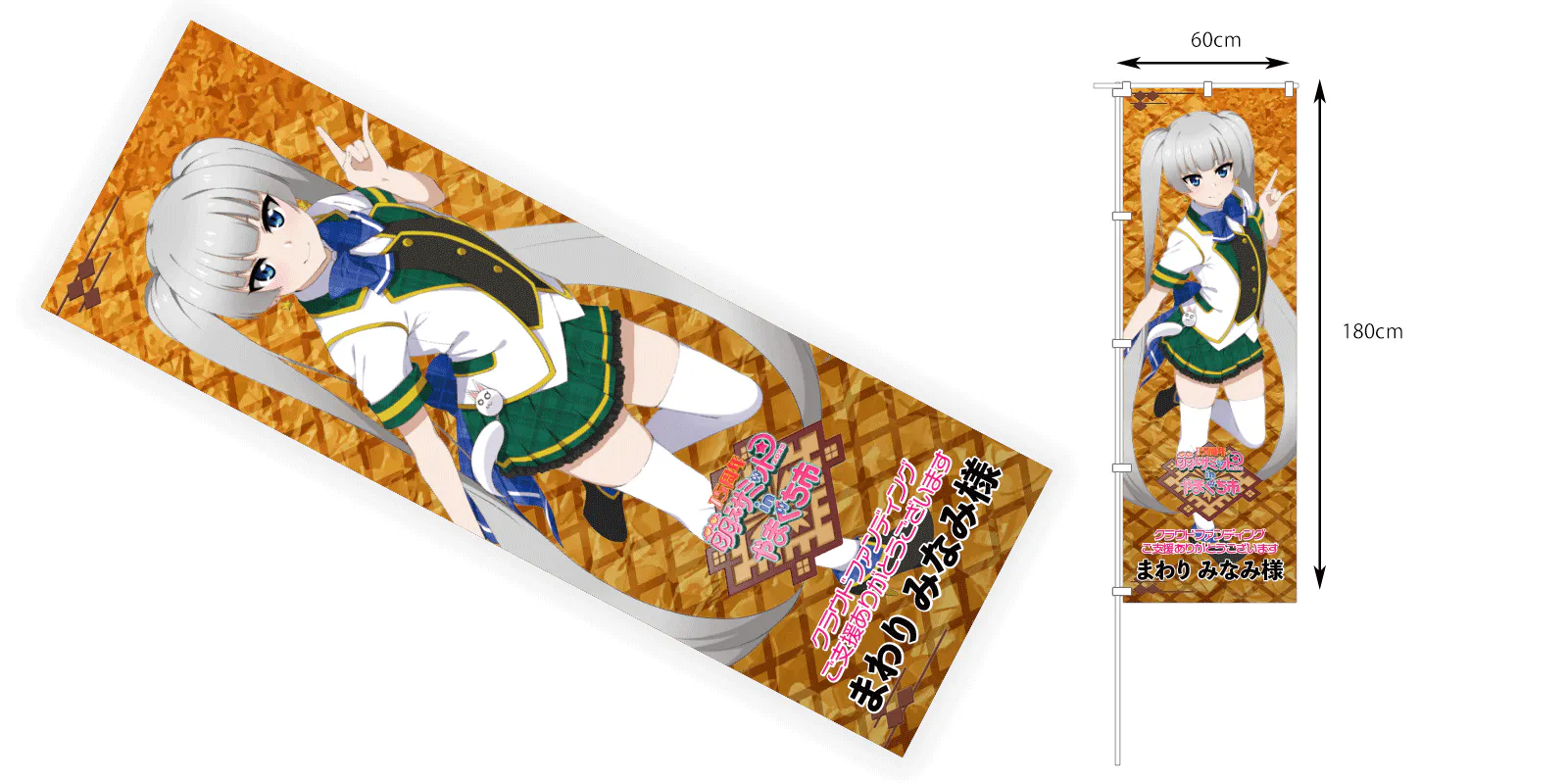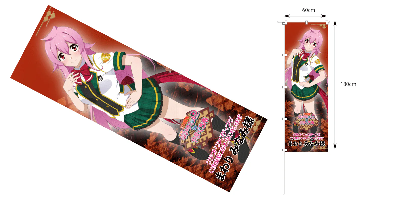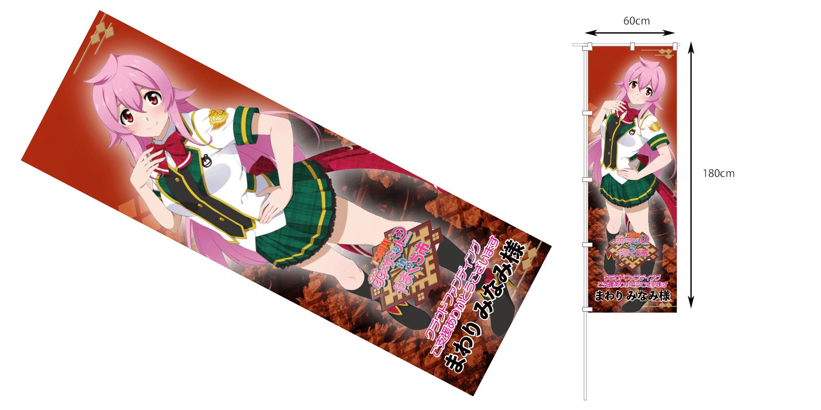 のぼりは、横60cm×縦180cmのビッグサイズで、のぼりとして使うのはもちろん、ほぼ等身大タペストリーや、助手席に敷いて痛カバー……みたいな使い方も出来ちゃう、使い方は無限大のお品となります(抱き枕に使うにはちょっとごわごわします)。