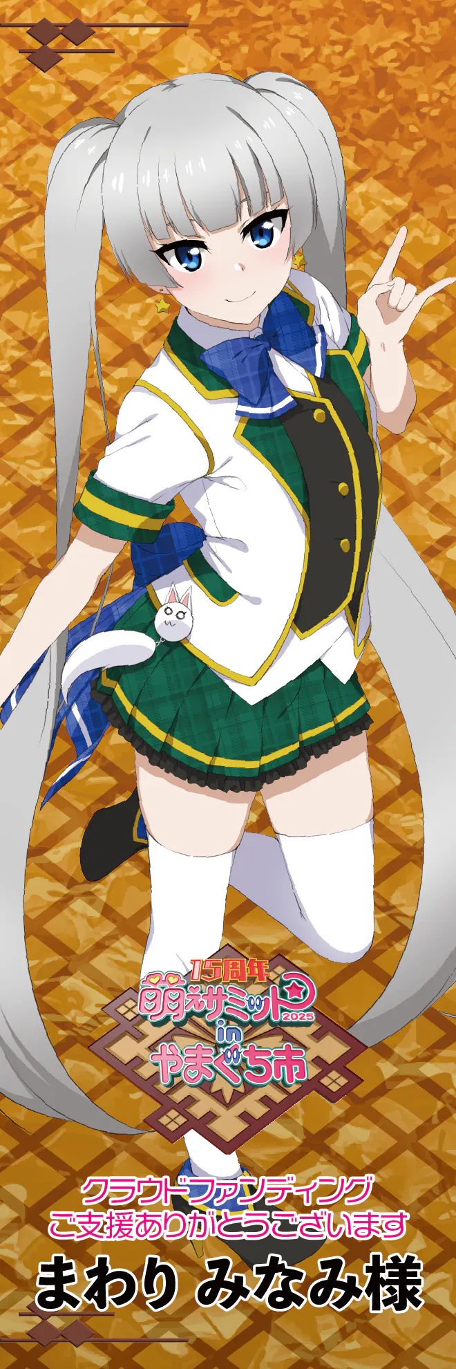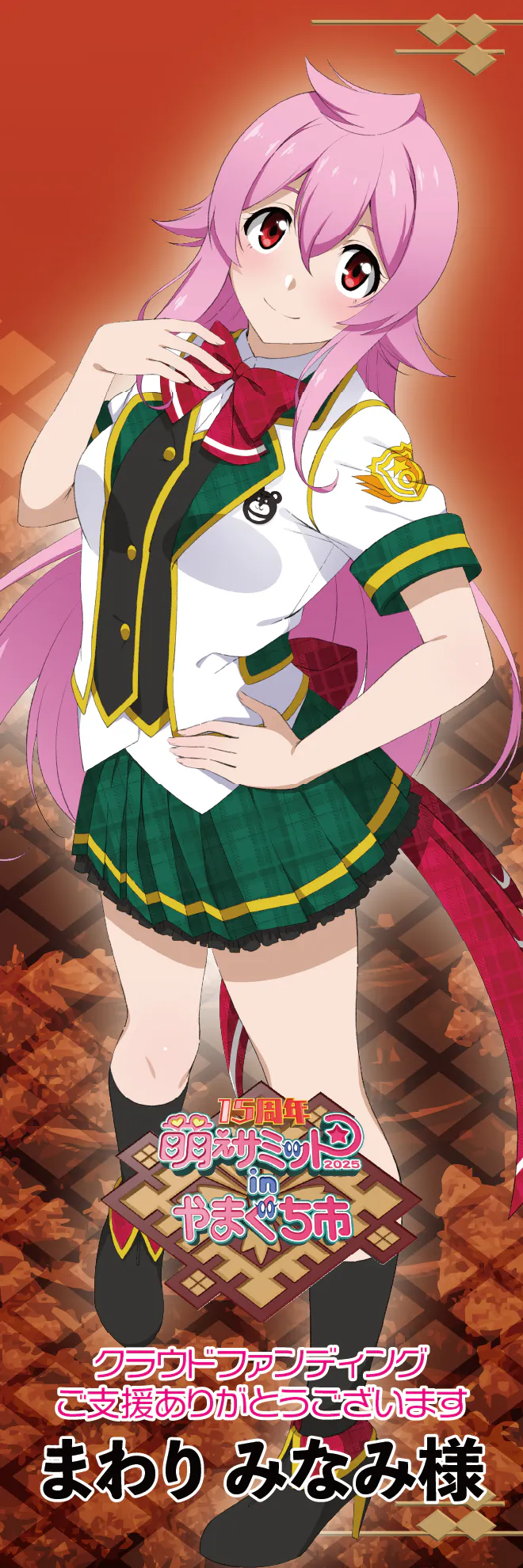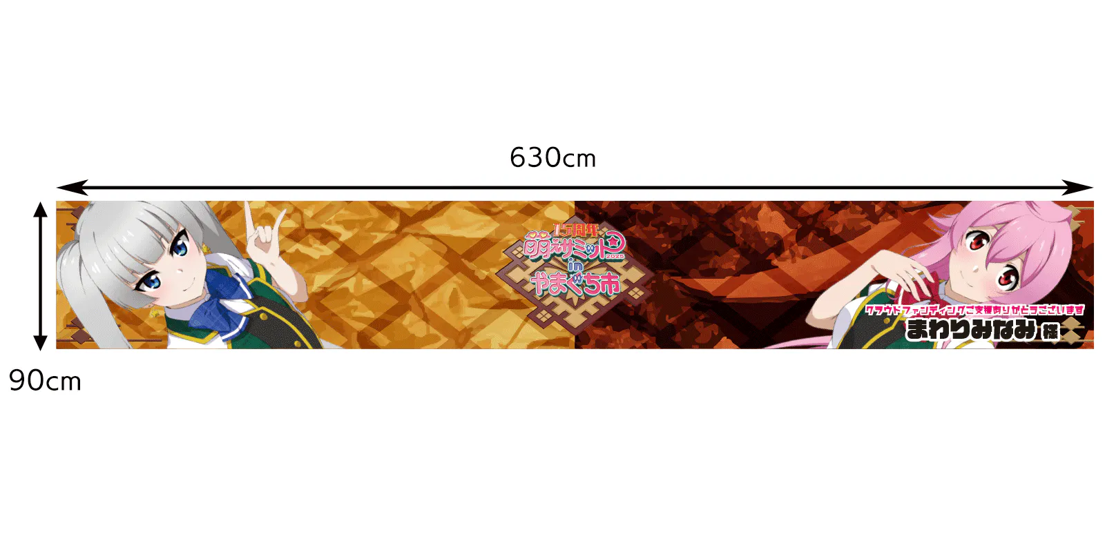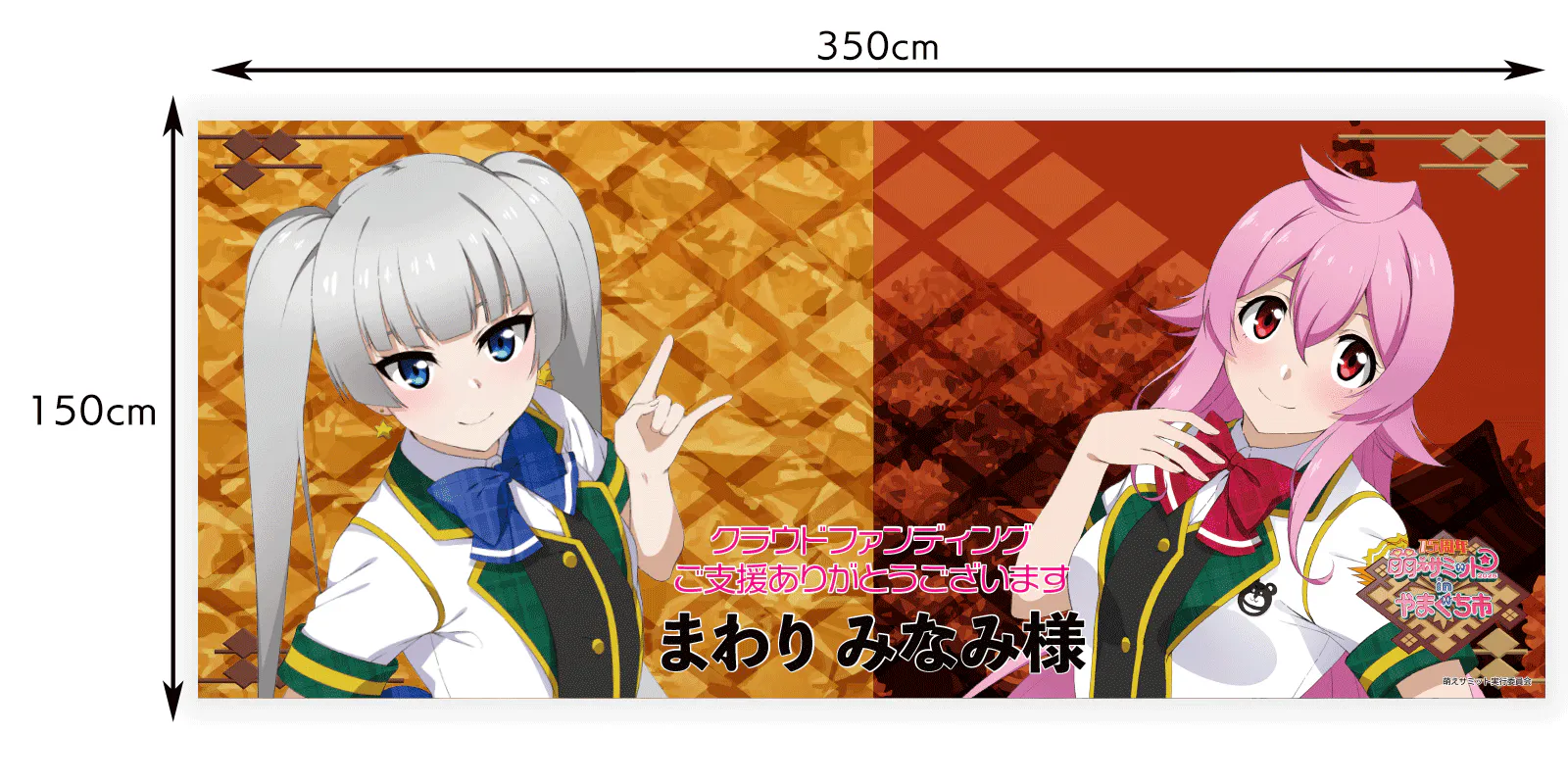 今回の萌えサミでメインステージとなる中市コミュニティホールNacのステージと、Nac前広場。そして餅まき会場となる、山口井筒屋前の合計3箇所に掲示予定の横断幕(横630cm×縦90cm)に、名入りのぼりと同じようにお名前を入れさせていただくコースです。
