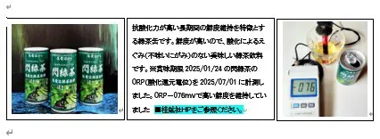 抗酸化力が高く、長期間の鮮度維持が特徴です。飲料は、酸化によるエグミ(不味い苦み)により、賞味が、劣化しますが、「閃緑茶」は、鮮度が維持されますので、作り立ての「美味しい」が、評判の商品です。