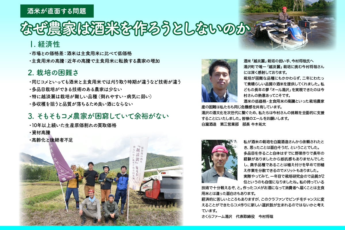 私たちは、このクラファンを単なる資金調達とは思っていません。純米吟醸「湯沢」と「さくらファーム湯沢」のことを多くの人に知ってもらい、ファンになってほしいと思っています。ファンの方々と一緒に酒造りとコメ作りをやりたい。それが私たちの思いです。