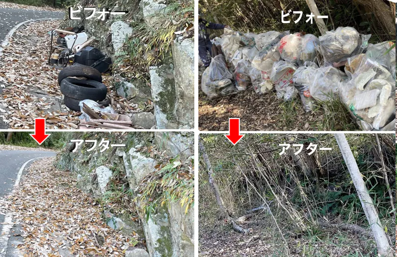 登山ブームもあり、向山へ遠方から来られる方も増える中で、瀬戸内海の美しい景観を損なっているのが不法投棄のゴミ。いつからか地元の方も気付かない間に始まり、缶・瓶から家電やタイヤ、その他の生活用品の投棄ゴミがおびただしい量になっていました。
