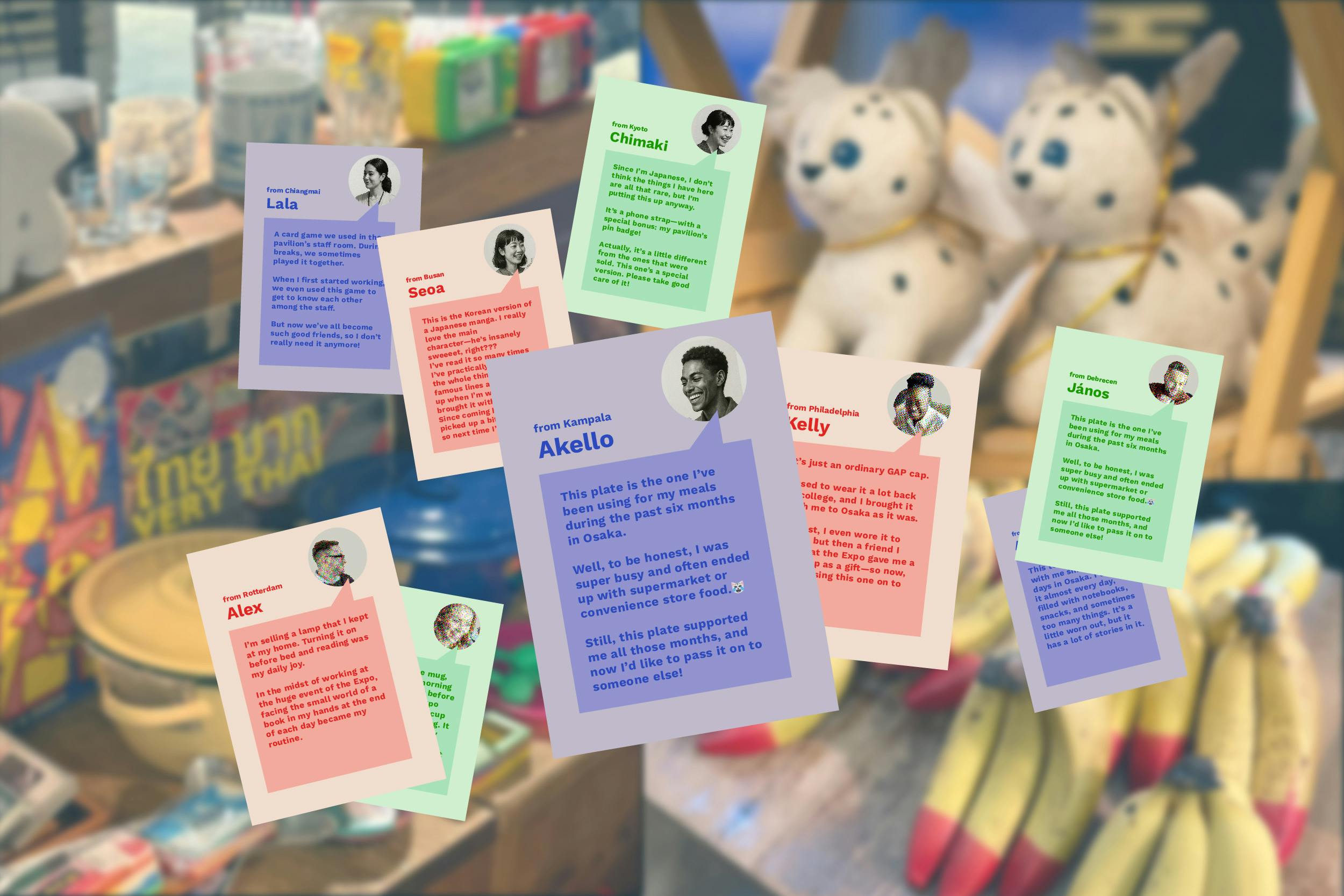 出品する物には、提供してくれたパビリオンの人からのメッセージを添える予定。たとえば「この衣装を着てステージに立った日のこと」や「展示をつくるときに苦労したこと」などなど……。