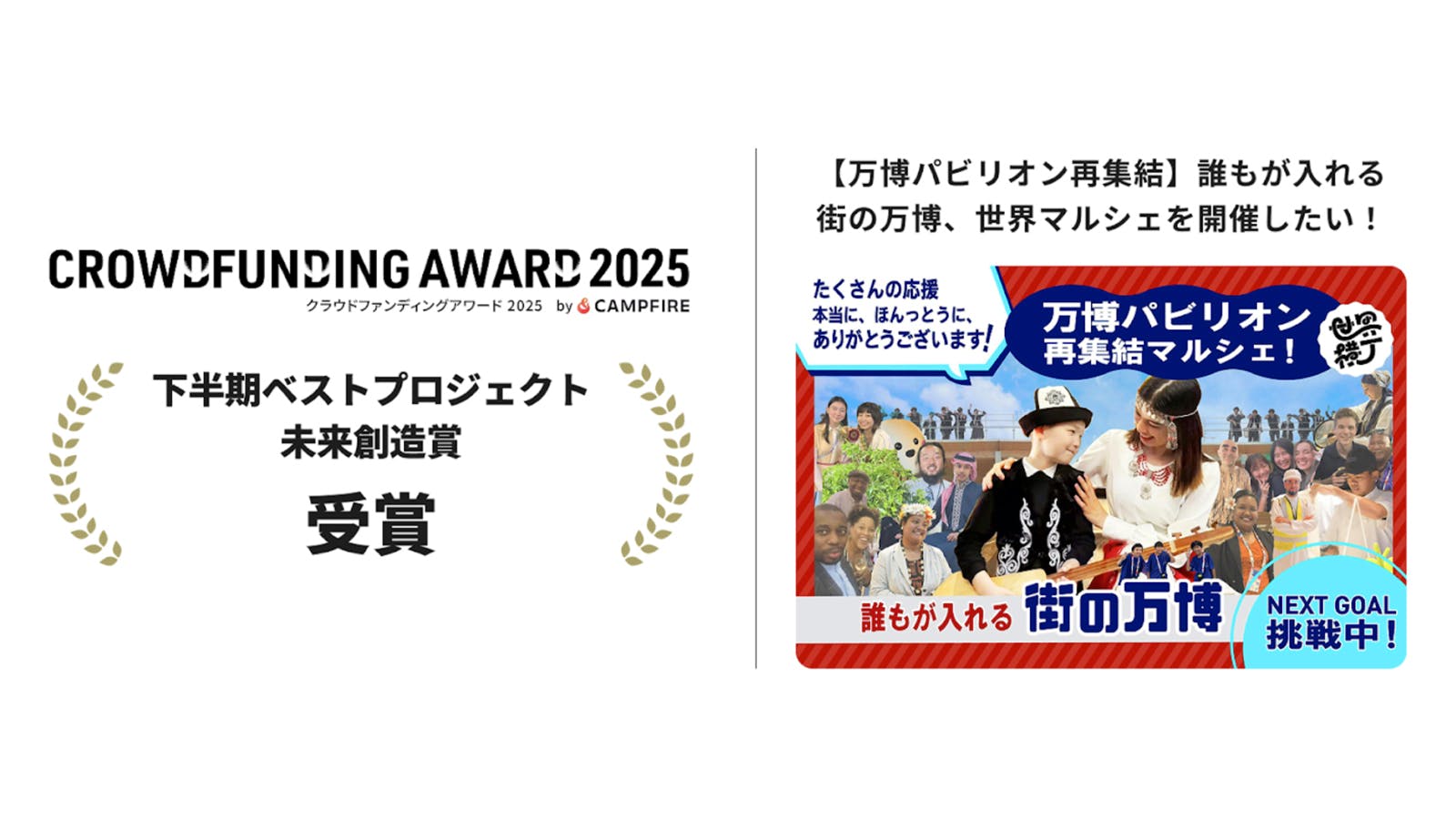 2025/12/31 18:28こんにちは。「世界横丁」主催のdemo!expoです。今年の最後に嬉しいニュースがあります!「世界横丁」への挑戦と、それを実現してくださったみなさんの応援が、なんと……!CAMPFIREの『クラウドファンディングアワード2025』の【下半期ベストプロジェクト/地域拠点部門・未来創造賞】を受賞しました!!!!!!https://camp-fire.jp/awards14,467件の中からの選出。すごい、本当にすごいことだ… !ちなみに受賞理由は、「万博の世界との出会いを街の文化へと昇華させ、多様性を日常に根づかせる継続的なビジョンが強い可能性を示したため」だそうです。すごく嬉しいことですね……!!賞の名に恥じぬよう、2026年も文化を繋げていきます。それではみなさん、どうぞ、よいお年をお迎えください。Happy holiday! もっと見る【ご支援いただいた皆さまへ】リターン進捗とお届け予定日のご案内