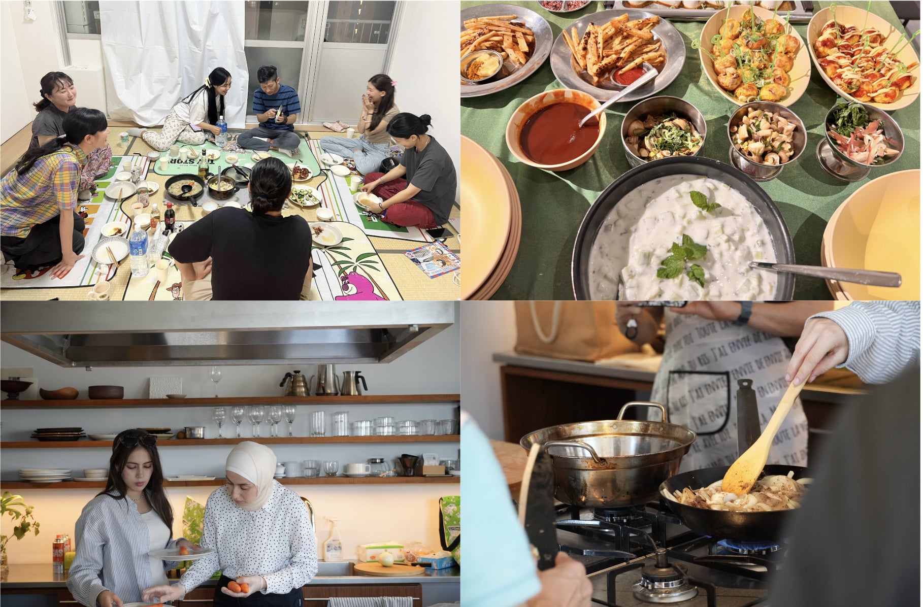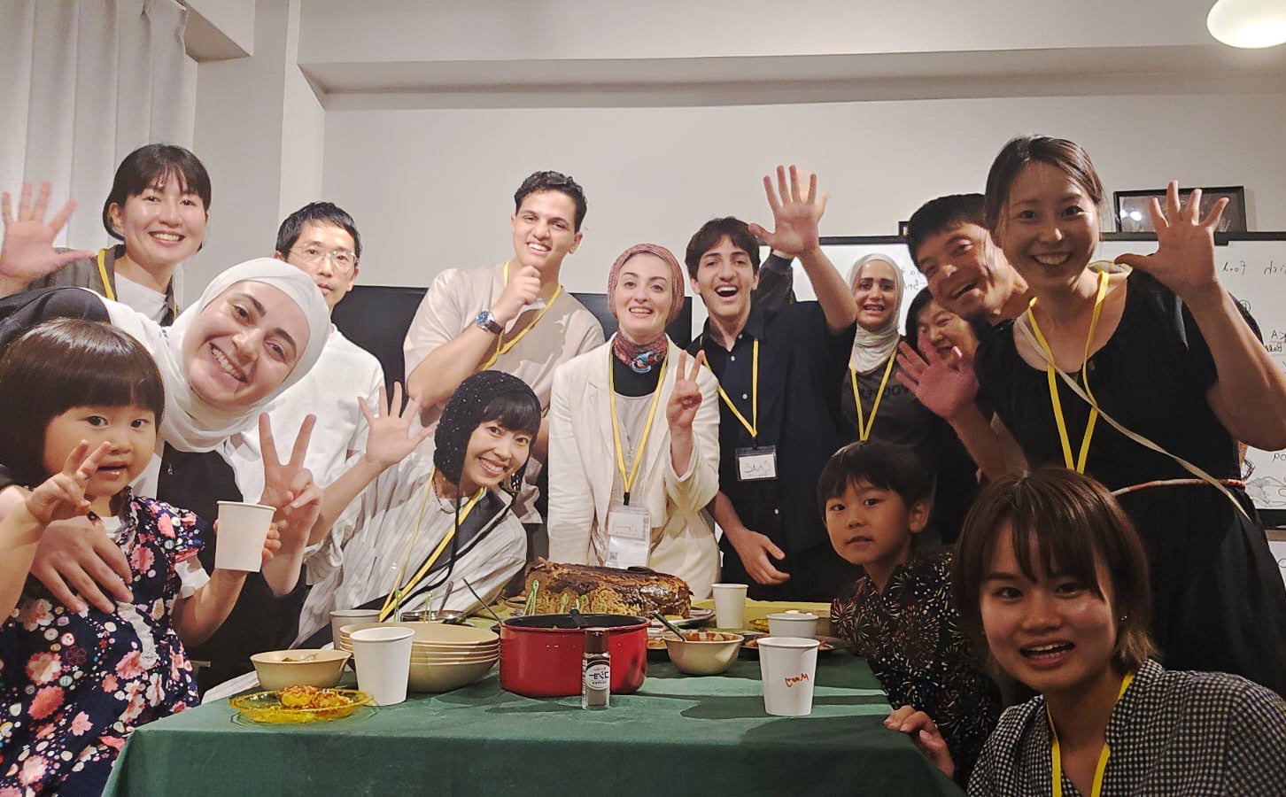 ヨルダンパビリオンチームとごはん会したときの写真。お互いの街の料理をみんなで作ったよ。