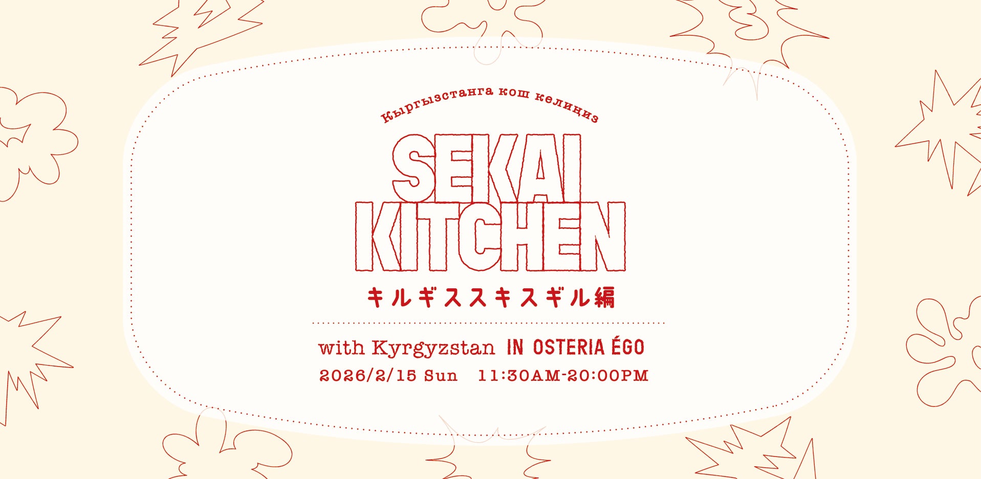 2026/02/08 11:04꧁———————꧂「世界横丁」食イベント第2弾「SEKAI KITCHEN」2/15開催!万博キルギスチーム×大阪の料理人が限定コラボメニューを提供します꧁———————꧂こんにちは、demo!expoです。おひさしぶりです!2025年10月に開催し、約5万人の皆様にお越しいただいたアフター万博イベント「世界横丁」。今日は、このプロジェクトを応援・実現してくださったみなさまにご案内です。「世界横丁」でも大人気で、予約ページ公開後、すぐに満席となってしまったコンテンツ「SEKAI KITCHEN」。その「SEKAI KITCHEN」が、前回のコラボ先のひとつ、大阪・関西万博のキルギスパビリオンチームと、もう一度開催することになりました!!!前回開催時の写真「世界横丁」のイベントでは、完全予約制のフルコース、会場である靭公園にロングテーブルを設置しての開催でしたが、今回はよりカジュアルに、たくさんのお客様にお楽しみいただけるよう、形式をアレンジ。前回開催時も多大なる協力をいただいた、靭公園隣接のレストラン「osteria égo(オステリアイーゴ)」のレストラン内にて、万博キルギスチーム直伝レシピをベースに、シェフが腕をふるいます。オステリアイーゴさん×万博キルギスチーム事前予約は不要。時間制のコースではなく、開催時間内にいつでもお越しいただけます。お料理は、ご来店時にワンドリンク+ワンプレートのチケット(2,500円)を購入いただき、追加のご希望があれば、キャッシュオンでお楽しみいただけます。さらに、前回と同じく、食以外でもキルギスを感じられるよう、店内では装飾や展示、音楽・ダンスパフォーマンスなども! 万博のパビリオンを巡るような感覚で、思い思いにお過ごしくださいね。꧁———꧂イベント概要꧁———꧂[イベント名]SEKAI KITCHEN キルギススキスギル編[会場]osteria égo(オステリアイーゴ)大阪府大阪市西区京町堀1丁目13−20Google Map [日時]2026年2月15日(日)11:30〜20:00※事前予約不要で、上記時間内にいつでもお越しいただけます。※会場は約40席です。当日の混雑状況によっては、待ち時間をいただいたり、整理券の配布など運営方法を変更する場合がございます。あらかじめご了承ください。[参加費]2,500円(税込/ワンドリンク+ワンプレート付)キルギス料理、オリジナルの「プロフ(中央アジア風炊き込みご飯)」をメインに、ワンプレートで提供予定。万博キルギスチーム直伝のレシピを、大阪のイタリア料理の名店「osteria égo」の山田シェフがアレンジします。その他のメニューの詳細は、当日会場にてご案内。追加のフード・ドリンクはキャッシュオンです。[イベント詳細ページ]https://peatix.com/event/4676310※外部サイト「Peatix」が開きます。[本イベントに関するお問合せ先]万博キルギスパビリオン出展チーム「アリエンタ株式会社」078-862-9779honey@arienta.jpなお、ご参加の際には「イベント詳細ページ」の内容・注意事項などをお読みいただき、ご来店ください。今後の情報については、イベント詳細ページや、万博キルギスパビリオンチームのinstagramより発信いたします。「前回、気付いたときにはもう満席に…」という方。「世界横丁で知り、次があれば行きたいと思ってた」という方。「万博にも世界横丁にも足を運べなかったので、この機会に!」という方も。2月15日開催のSEKAI KITCHEN キルギス編でお会いできることを楽しみにしております。みなさまのご参加・ご来店、お待ちしております! もっと見る