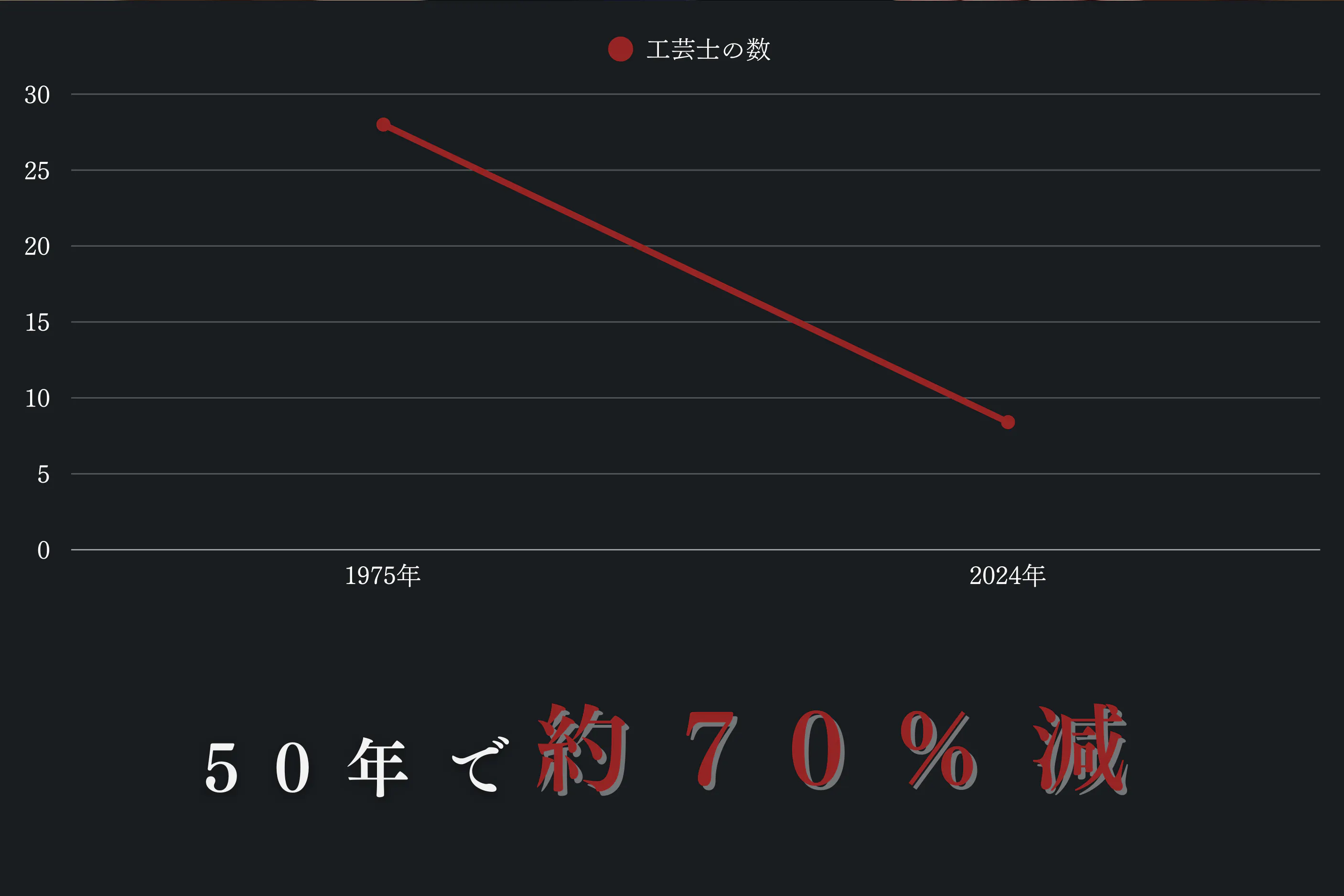 日本の伝統工芸品従事者数は、この50年で約70%減少しています。