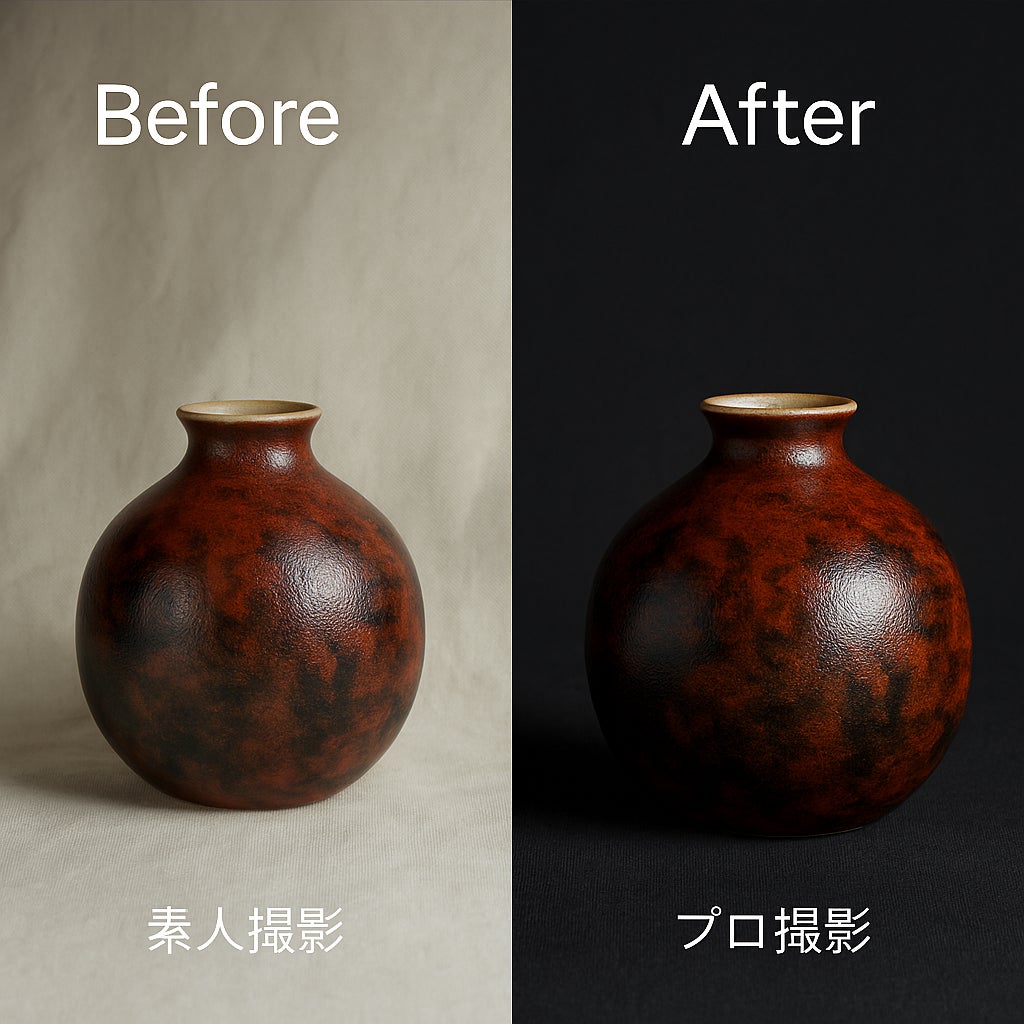 [ビフォーアフター: 素人撮影 vs プロ撮影の作品写真]