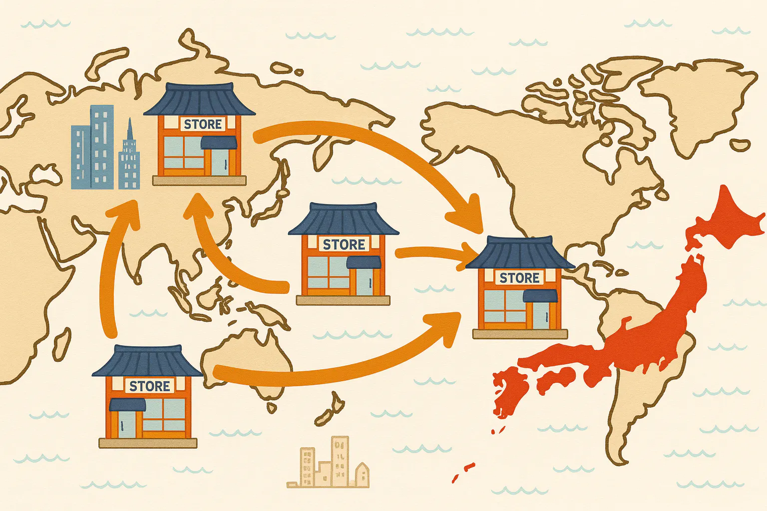 実店舗(京都)→ ECサイト(全国)→ 越境EC(世界)