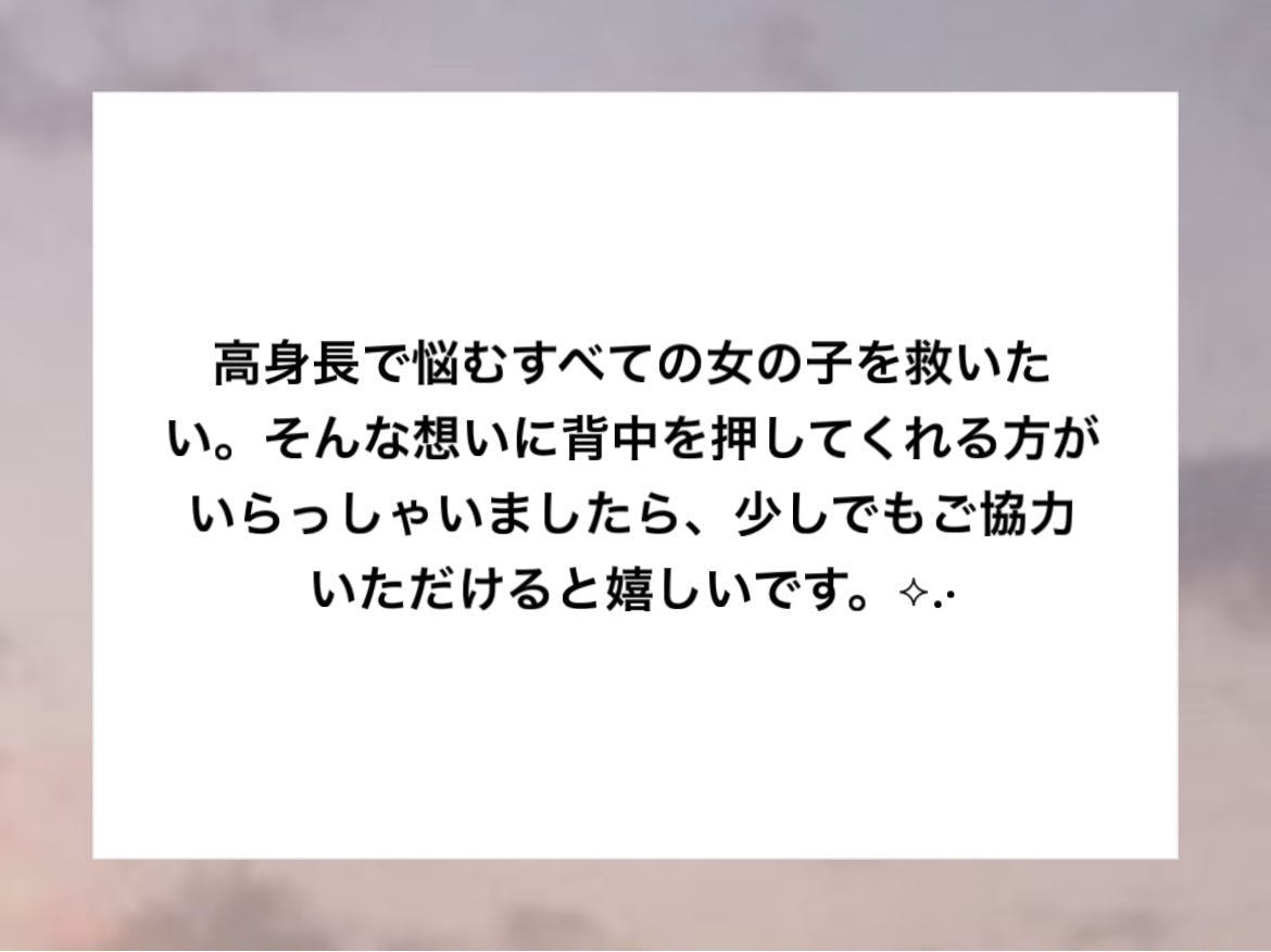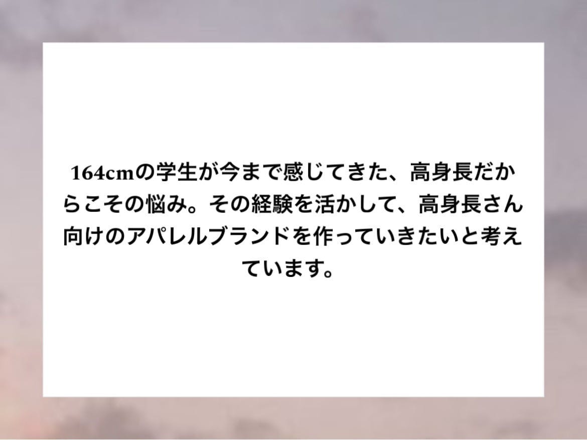 私は身長164cmの学生です。高身長という個性を持つ私自身が、日々のファッションにおいて感じる悩みからこのプロジェクトを立ち上げました。特に、高身長女子が直面する「丈が合わない」「ミニスカートが短すぎる」といった悩みを解決したいという思いが強く、同じような悩みを抱える方々に寄り添いたいと考えています。自分の体験を通じて、より多くの人々が自分らしくおしゃれを楽しめるようなファッションを提供したいと思っています。