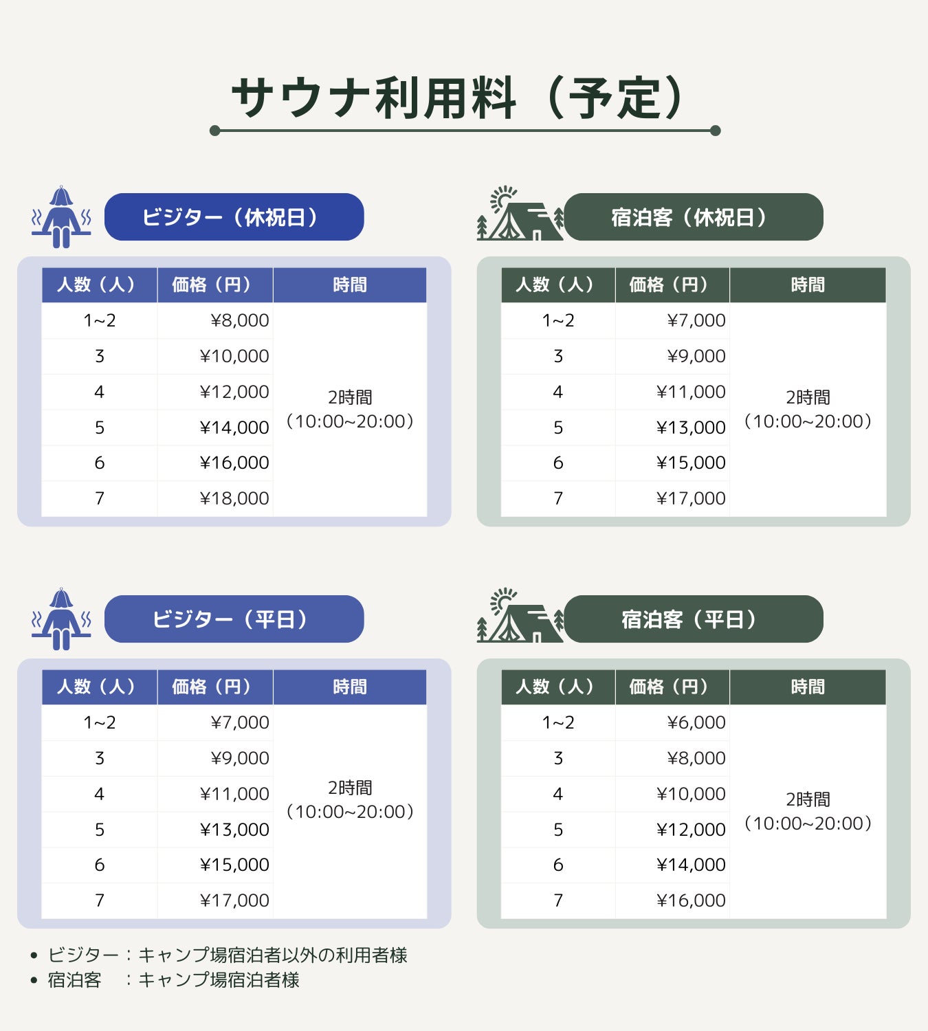 - サウナ施設の料金体系(現在の予定であり変更の可能性有):以下の通りです