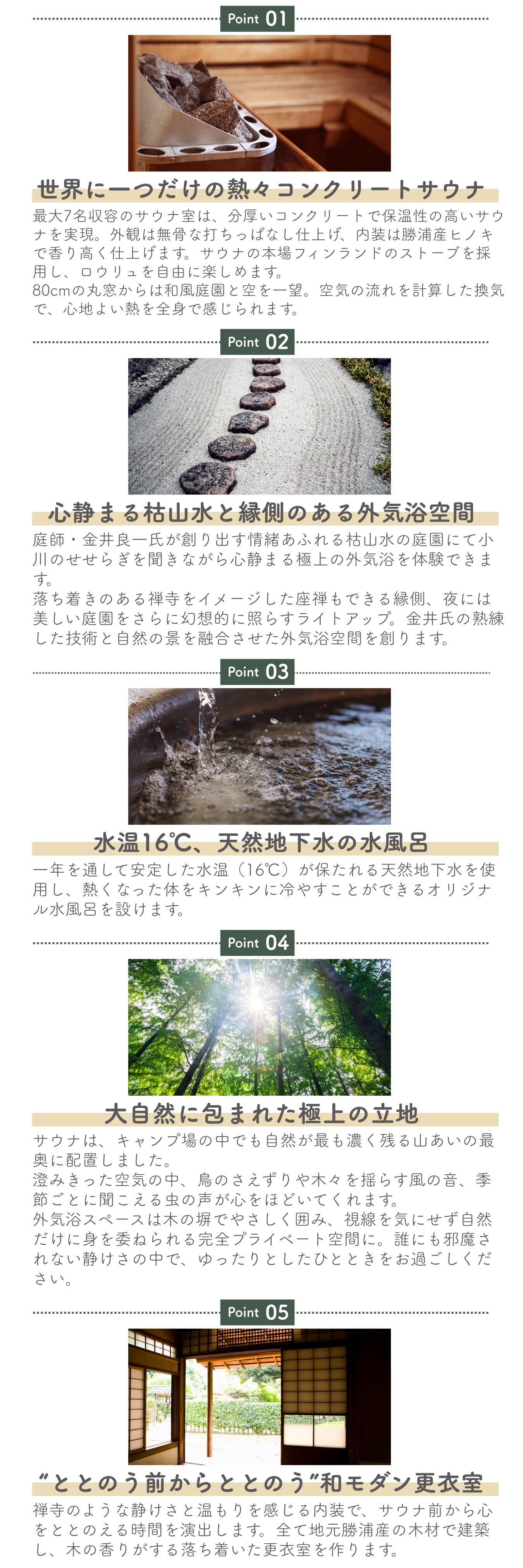 “ととのい”には、サウナ室の「熱」、水風呂の「冷」、外気浴の「静」の3要素が欠かせません。この3つの要素のレベルを限りなく高め、極上のサウナ体験を味わっていただくために当サウナ施設には5つのこだわりを込めました。