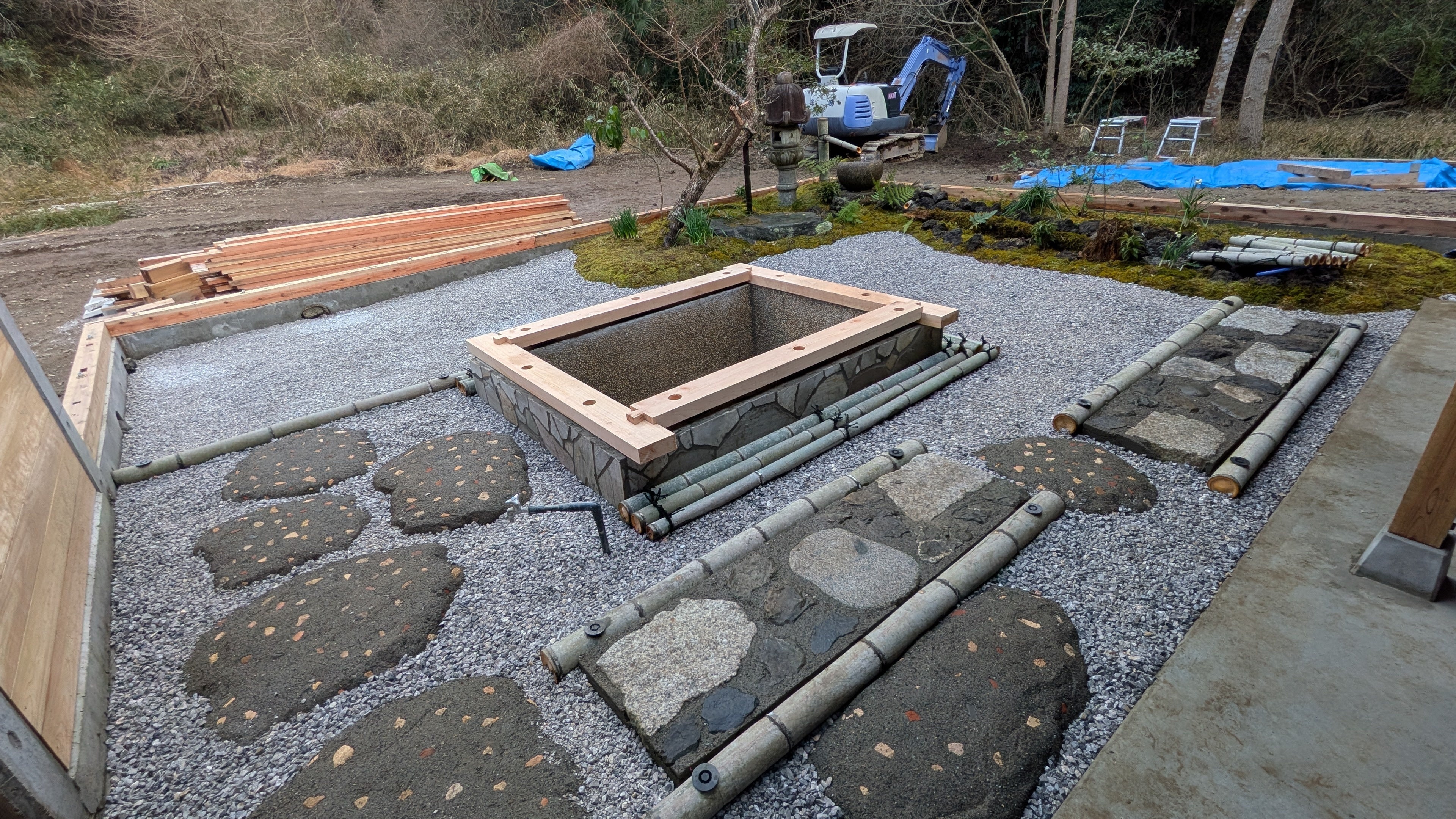2026/03/22 23:44ついに、このプロジェクトの大きな核となる日本庭園が完成しました。今回の庭園は、テレビ番組「大改造!!劇的ビフォーアフター」でお馴染みの “庭の匠” 金井良一さん率いるチームの皆さまに手がけていただきました。制作期間は、わずか1週間。何もなかった空間に、次々と土・石・植物など据えられ、あたかももともとそこにあったかのような美しい景観が出来上がっていく。その変化のスピードと美しさに、現場にいながら何度も驚かされました。今回の庭づくりで特に印象的だったのが、金井さんの「その土地の素材を活かす」という考え方です。この考え方には、単にコストを抑えるという意味だけではなく、この場所にあるモノ(石や植物など)を使うことで、もともとそこにあったかのように風景になじむ庭が生まれる、という想いが込められています。「その土地の素材は、自然と風景になじむんだよ」という金井さんの言葉が、強く心に残っています。そのような想いと金井さんの技術のもと、ここでしか成立しない唯一無二の庭園が完成しました。今回の庭園は、ただ眺めるためのものではなく、サウナ後の時間を最大限に深めるための場として設計されています。まず、象徴的なのが筧(かけい)です。竹を通って静かに水が落ちるその音は、耳に入った瞬間、自然と呼吸を整えてくれます。水が蹲(つくばい)に落ち、やさしく波紋を広げるその様子は、見ているだけで心が静まります。そこから流れ出た水は、庭の中に設けた小川へとつながります。川のせせらぎが、サウナ後の感覚をさらに研ぎ澄ませてくれます。庭の中には、やわらかく地面を覆う苔が広がっています。苔の持つ落ち着いた色合いと質感が、空間全体を包み込み、どこか時間の流れがゆるやかになるような感覚を生み出します。また、庭園の象徴として配置された梅の木や、さまざまな植物が、季節の移ろいを感じさせてくれます。訪れるたびに異なる表情を見せてくれるのも、この庭の魅力のひとつです。そして、この外気浴スペースの中心にあるのが、和モダンに仕上げた水風呂です。周りの景観と調和しながら、しっかりと身体を冷やす、この空間の核となる存在です。足元には、延段(のべだん)や飛び石を配置し、 一歩一歩、自然と歩みが整う動線が作られています。水の音、石の感触、季節の移ろい、風の抜け方。五感全てで、この自然を感じられる庭園になりました。プロジェクト概要でもご説明した通り、今回のご縁は、私自身が金井さんの大ファンだったことから始まりました。思い切ってオファーをさせていただき、そこから何度も打ち合わせを重ね、今回の実現に至りました。実際にご一緒して感じたのは、金井さんのお人柄の温かさです。その影響もあってか、チームの皆さまもとても明るく、 終始和やかな雰囲気の中で庭づくりが進んでいきました。山から植物を探しに行く姿。石を選び、配置を考える姿。そして何より、純粋に庭づくりを楽しんでいる姿。チームが一つになって、ひとつの空間をつくり上げていく。その光景に、ものづくりの本質を見た気がします。この庭園が完成した今、「本当にお願いしてよかった」と心から感じています。残すは、 更衣室の内装、サウナ室の内装、空間全体を囲む塀の施工です。いよいよ完成が見えてきました。金井さんチームが作り上げてくださったこの庭園を、決して無駄にしない、この空間にふさわしいサウナ施設を、最後までこだわり抜いて完成させます。ここまで来られたのは、応援してくださっている皆さまのおかげです。引き続き、完成までの過程をお届けしていきますので、ぜひ楽しみにしていただけたら嬉しいです。 もっと見る