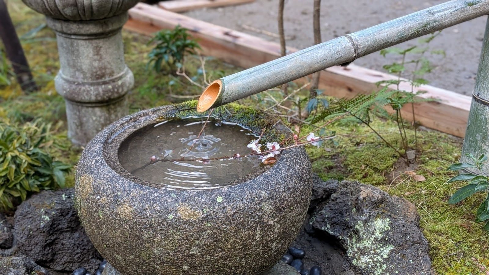まず、象徴的なのが筧(かけい)です。竹を通って静かに水が落ちるその音は、耳に入った瞬間、自然と呼吸を整えてくれます。水が蹲(つくばい)に落ち、やさしく波紋を広げるその様子は、見ているだけで心が静まります。