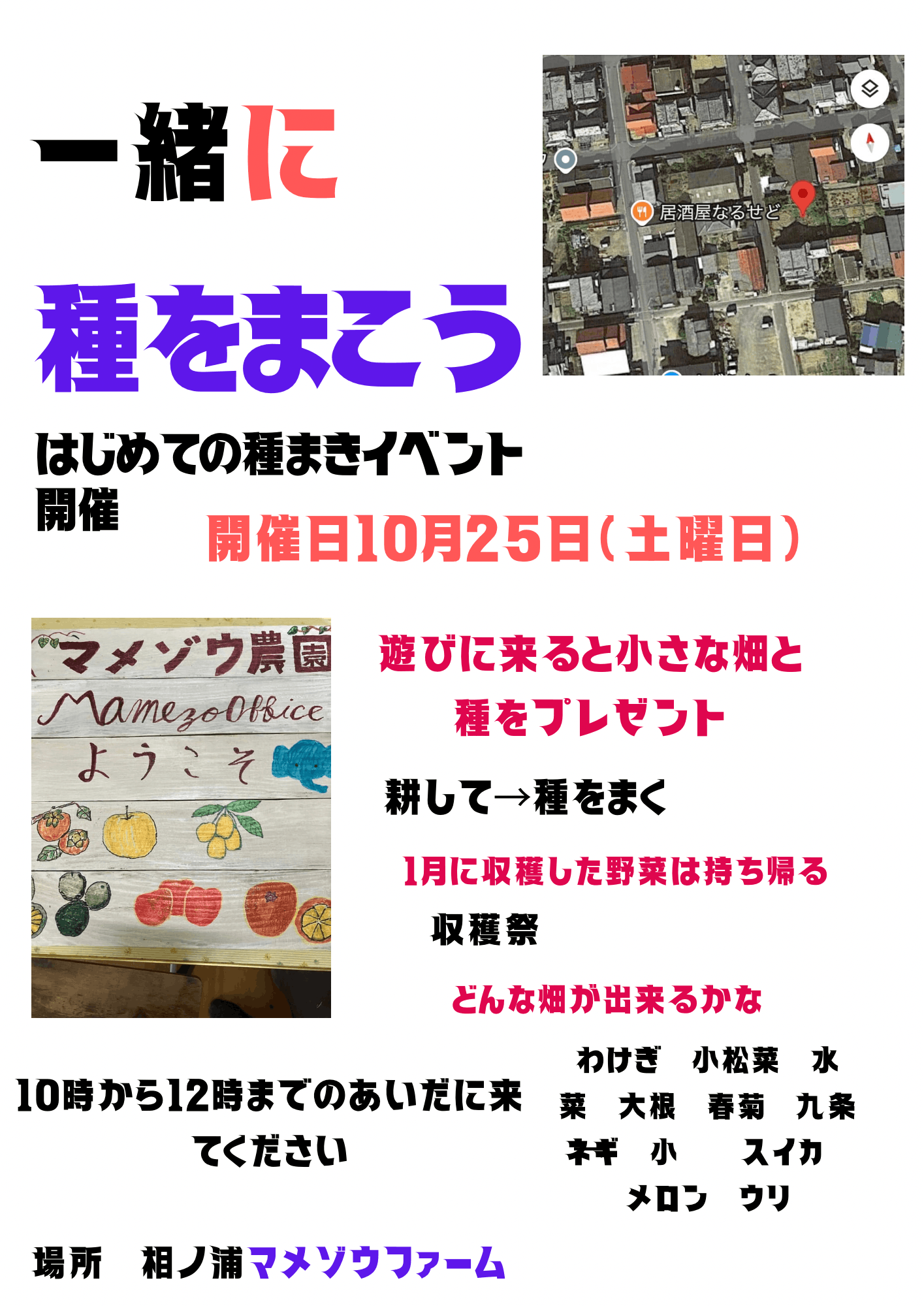冬の鍋に使う種を蒔きます。来てくれたら、種を畑に蒔きます。蒔た種が実ったら、自分の畑で収穫した野菜は持ち帰れます。奈留島の方、ぜひご参加ください。先着順になります。なくなり次第終了です。