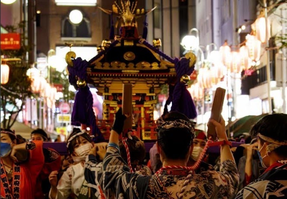 ピカピカになった神輿で中洲の町を練り歩き中洲全体が
