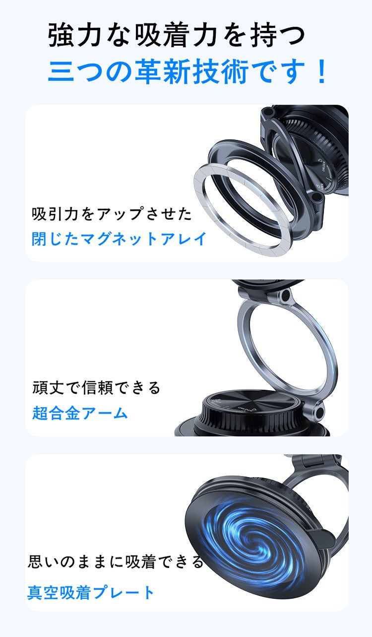 この三つの革新技術は、強力で安定した吸着力を提供し、耐久性や使いやすさを兼ね備えています。さらに、さまざまなデバイスに対応できる柔軟性とスタイリッシュなデザインを実現しています。