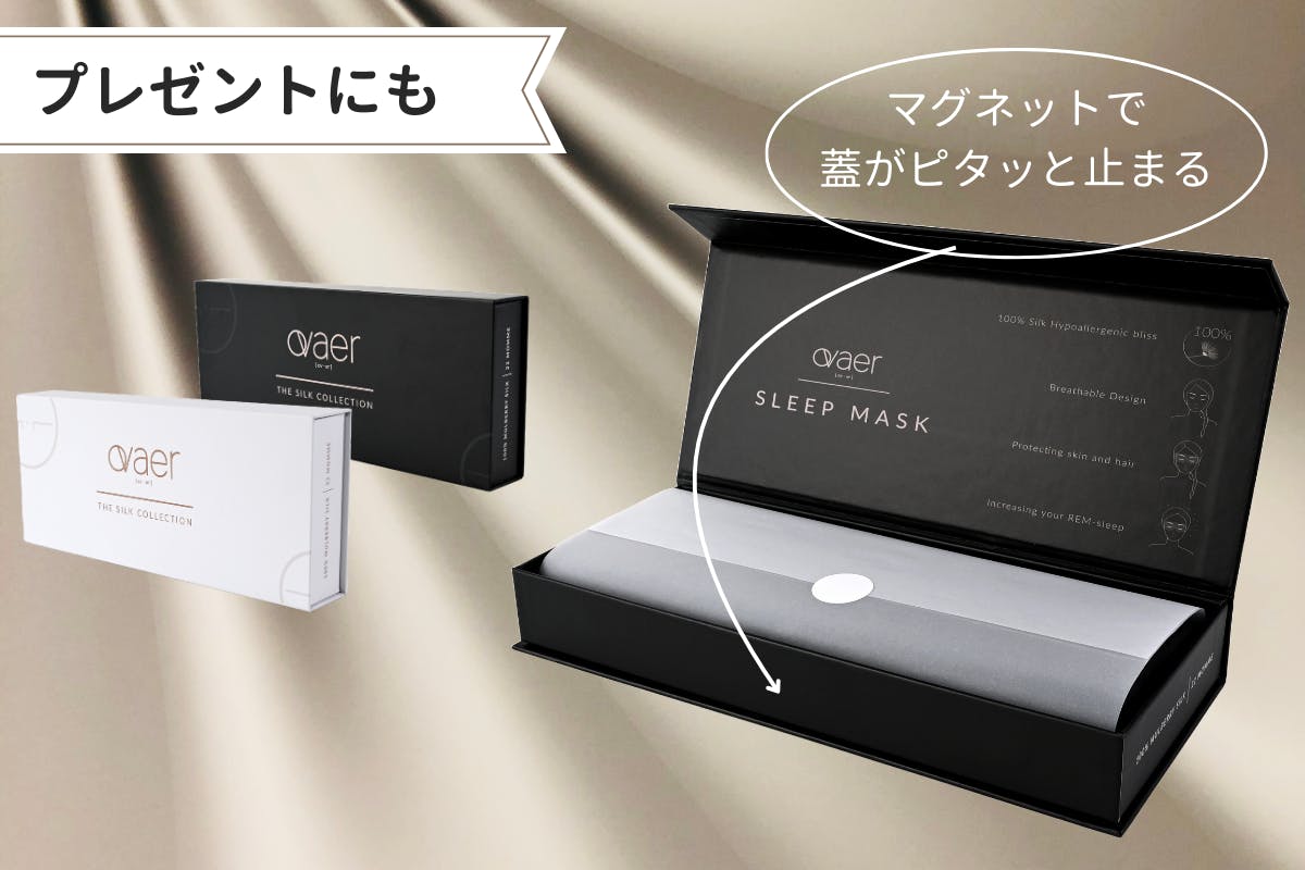 Ovaerプレミアム・アイマスクは、マグネットで蓋がピタッと止まる上質な磁気ボックスに入っており、自分へのご褒美や大切な方へのプレゼントにも最適です。