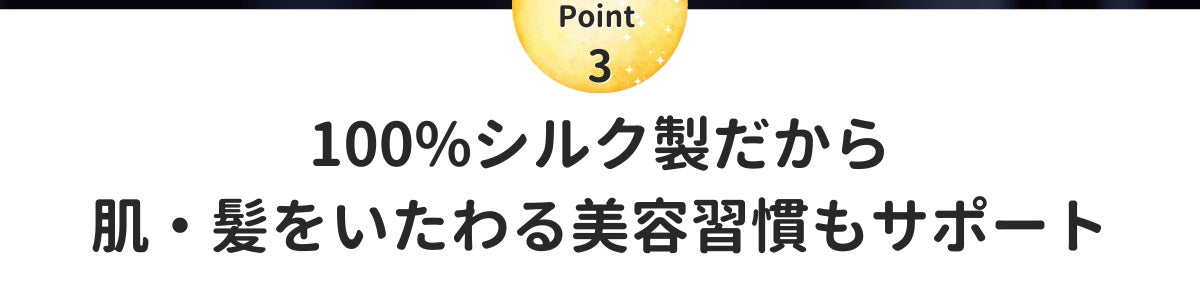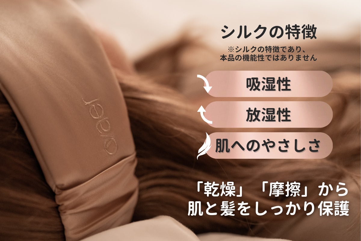 シルクには、その滑らかさに加え、吸湿性、放湿性、肌へのやさしさ、という優れた特性があり、これらシルクの特性が「乾燥」「摩擦」から肌と髪を保護してくれます。