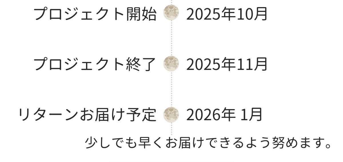 ※本文中に記載させていただいたスケジュールは、あくまでプロジェクト公開時点の予定です。ご支援の数が想定を上回った場合、製造工程の都合等により、配送遅延のおそれがございます。
