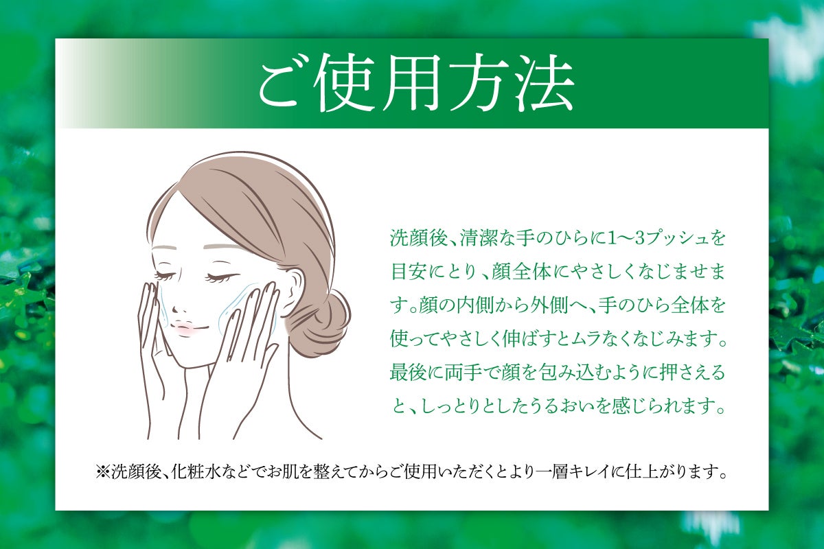 洗顔後、清潔な手のひらに1〜3プッシュを目安にとり、顔全体にやさしくなじませます。