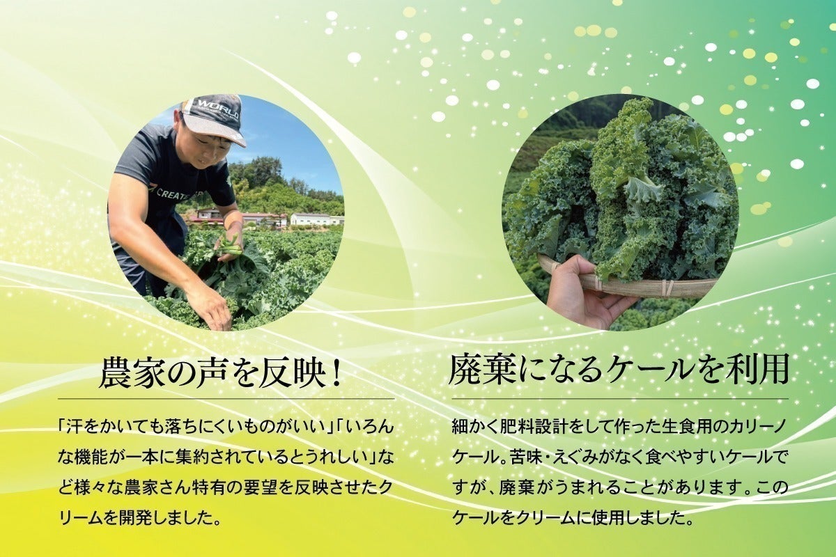「CelluKale」は、炎天下の中で長時間働く農業法人のメンバーと1次産業の未来を真剣に考えるメンバーが「人々の肌を本気で守るため」に開発したスキンケアです。
