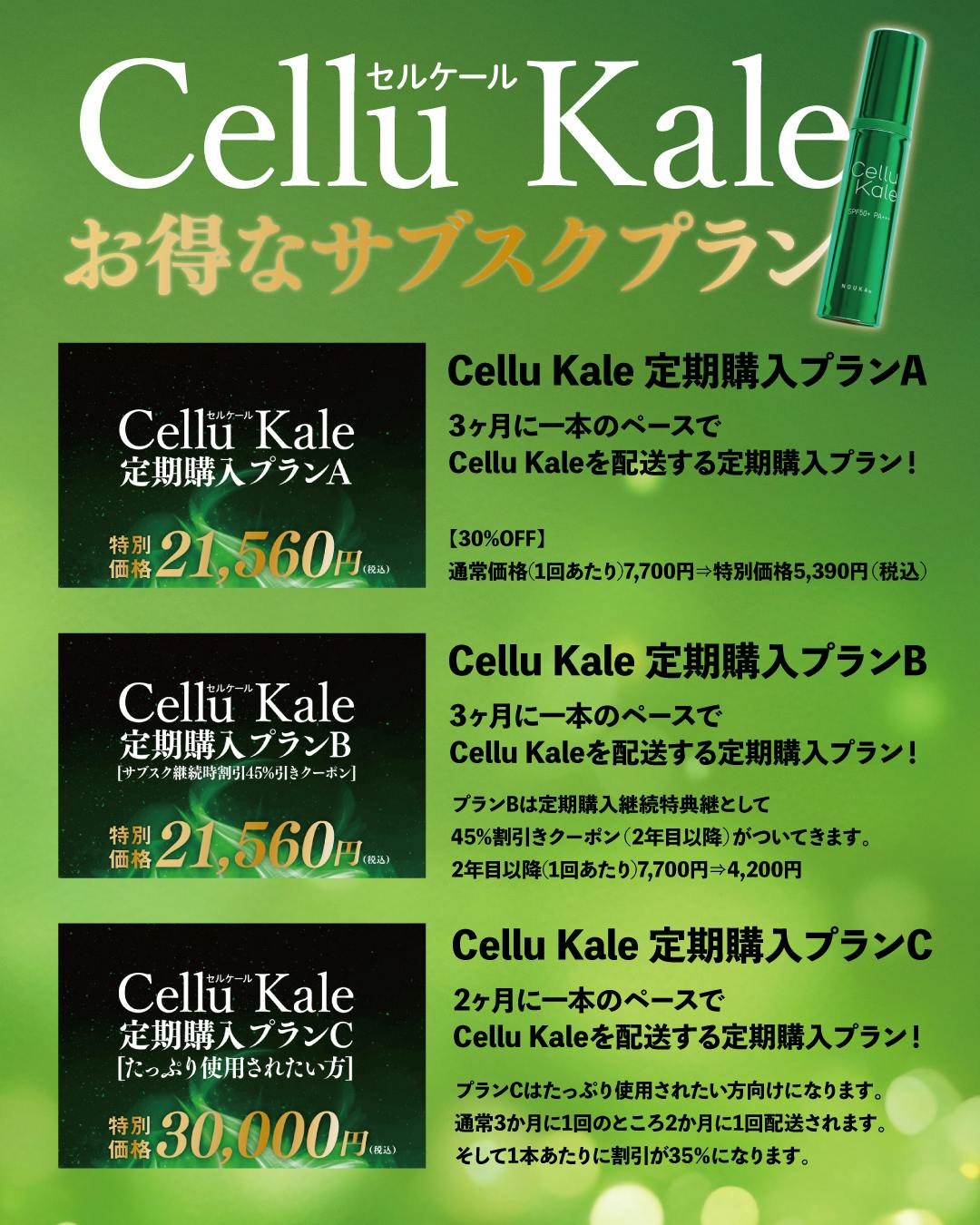 定期購入プランはいわば「サブスクプラン」。年間分の金額をお支払いいただくことで、定期的に「CelluKale」が届く優れものです。