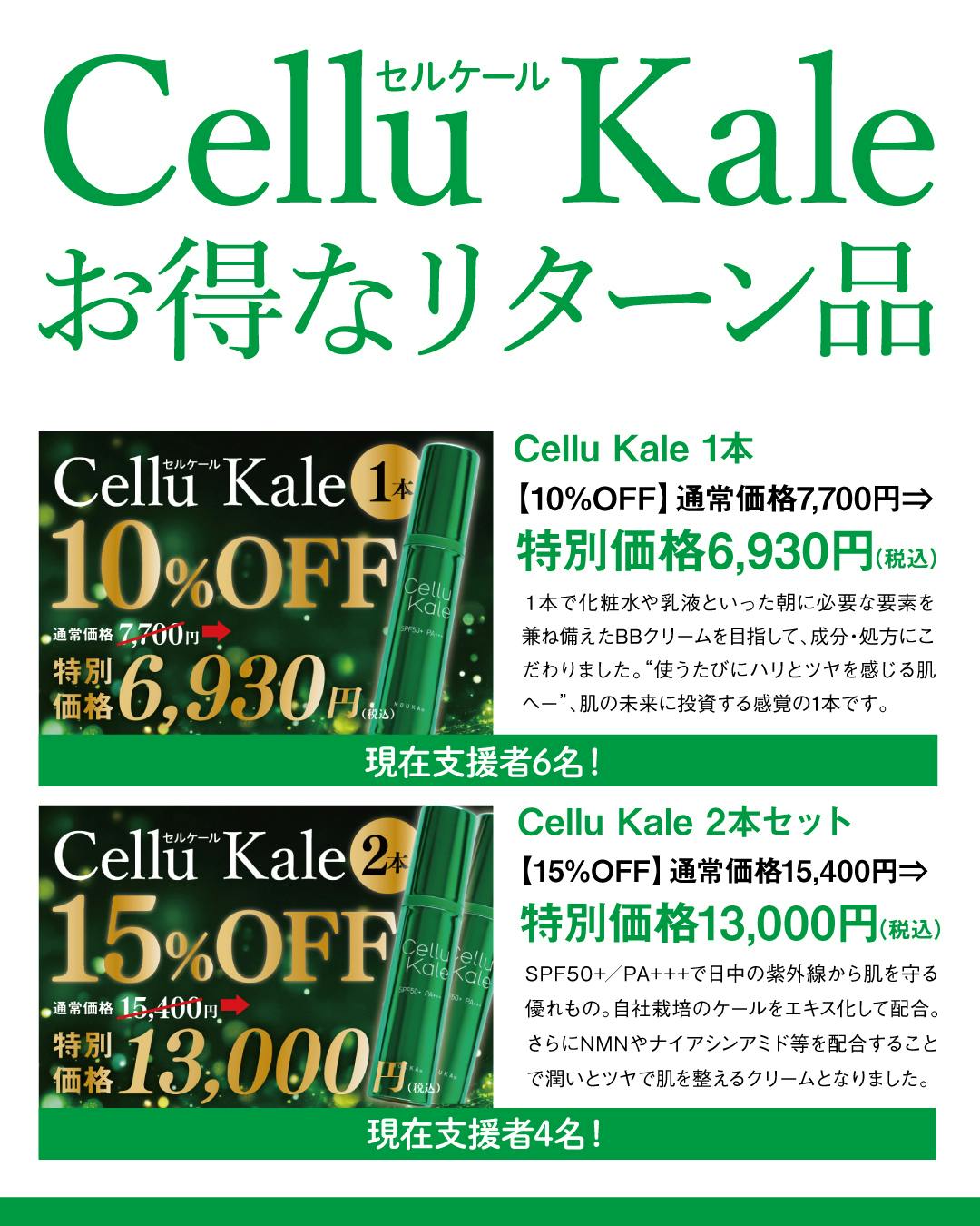 弊社栽培のケールをエキス化し、配合した基礎化粧品「CelluKale」をたくさんの方にひろめるためクラウドファンディングを実施中です!