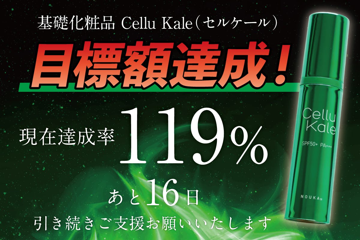ご支援いただいた皆様のおかげで、クラウドファンディングを初めてまだ初めて一週間ほどですが、すでに目標額の半分を超えました!皆様の拡散・口コミ・ご支援のおかげでたくさんの方々にプロジェクトをみていただいております。ありがとうございます。「Cell kale」は農家の方をはじめとする、紫外線にさらされるすべての人のための基礎化粧品です。できるだけ多くの方の肌にうるおいを与えたい。その一念で商品開発をしてきました。まだ終了まで20日近くあります。たくさんの方々に「Cellkale」が届くことを願って広報活動をつづけていく所存です!ご支援ありがとうございます。そして応援をいつもありがとうございます!!
