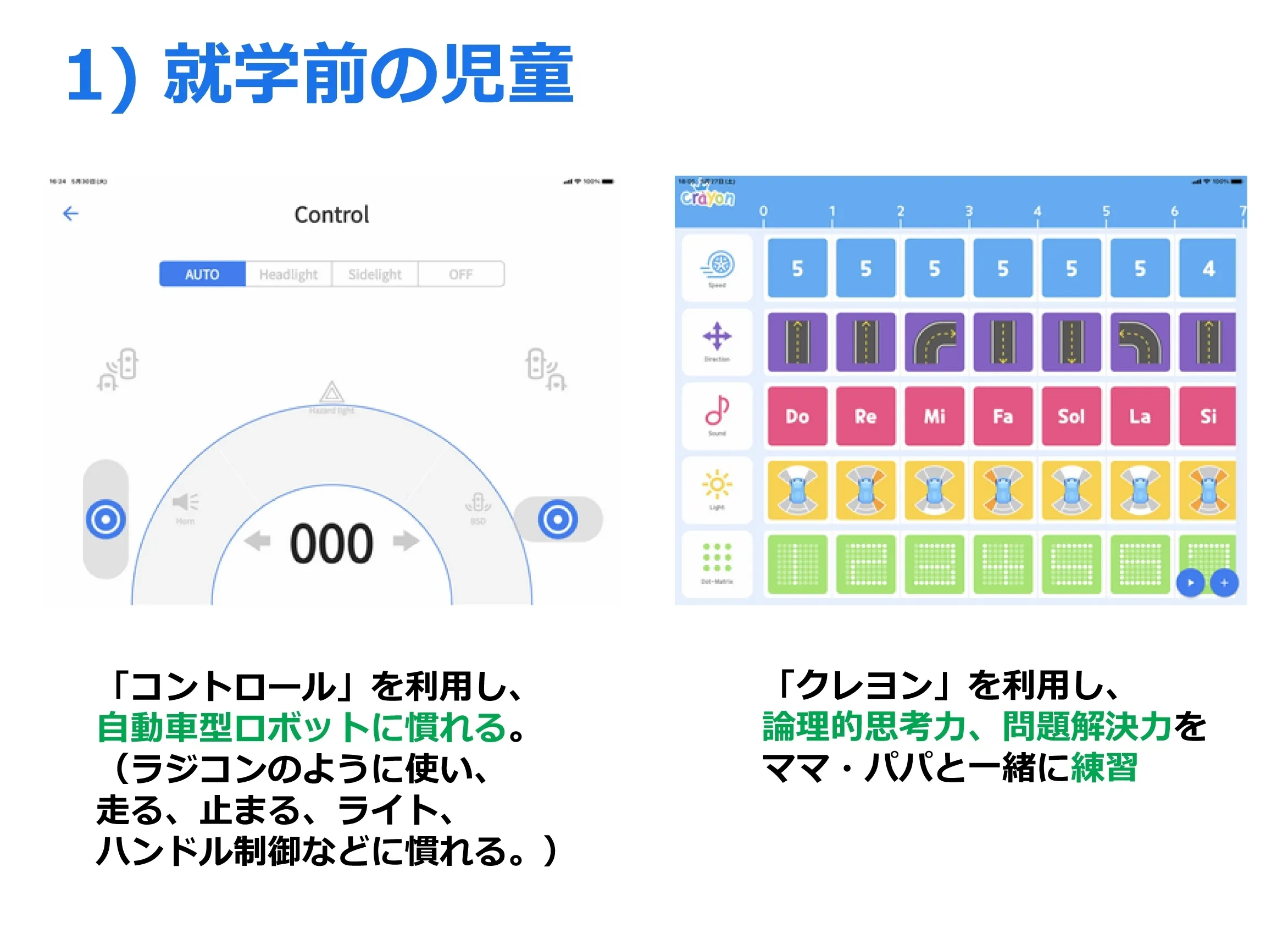 就学前の児童を対象とする、プログラミングの未経験者から、お子様(6歳~)や親子様で楽しめる学習ツールです。このツールはプログラミングの知識が無くても、簡単にアルティノを操作できます。クレヨンは論理的思考のトレーニングに使用されています。最近ではお子さまだけでなく、高齢者の脳トレにも活用されています。