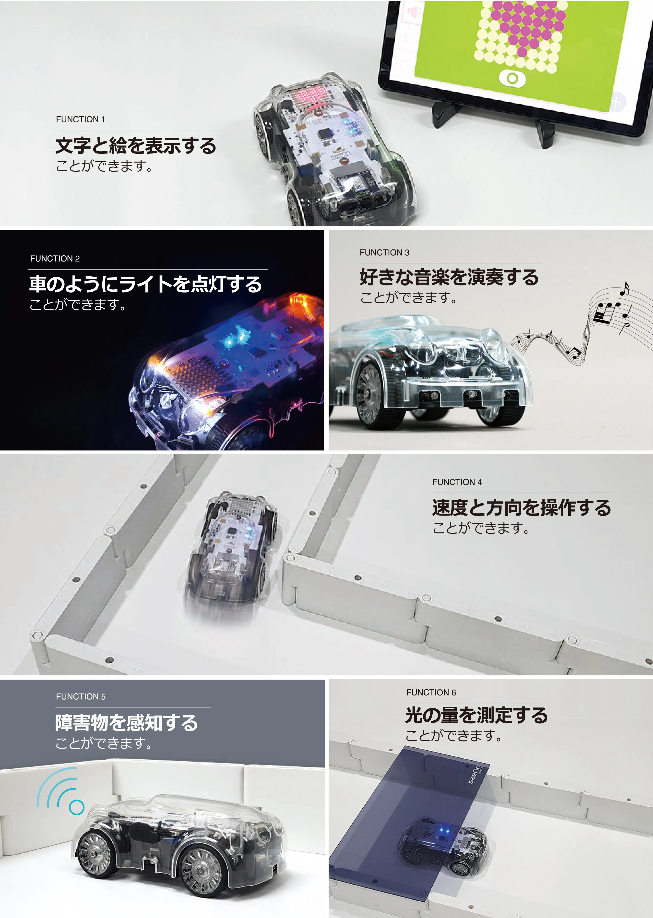 同社が開発した代表的な製品が、教育用ロボット ALTINO(アルティノ) です。ALTINOは、自動車のような形をした知育ロボットで、LEDライト、超音波センサー、赤外線センサー、加速度センサーなど多彩な機能を搭載。Bluetooth接続により、パソコンやタブレットからプログラミングを行い、前進・停止・旋回などの動作を自由に制御できます。子どもたちは自分の考えたプログラムが実際にロボットの動きとなって現れる体験を通じて、論理的思考力や創造力を自然に身につけることができます。