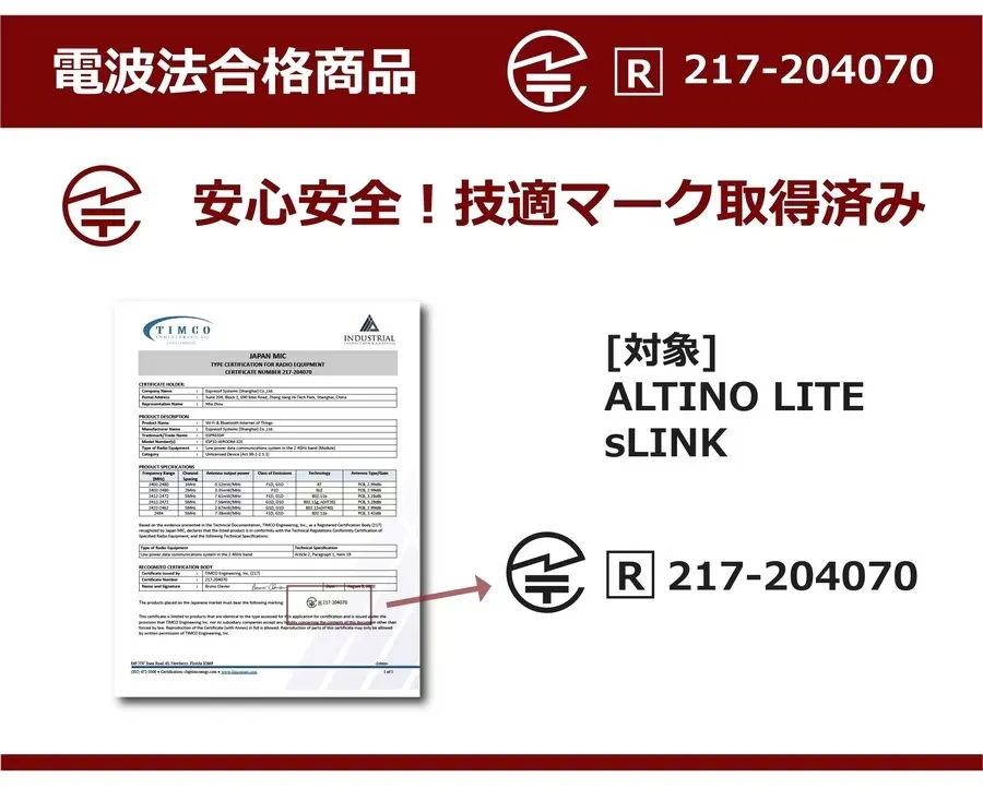 ALTINO LITE専用のアクセサリ『sLINK』はブルートゥースが搭載されていないパソコンで使用するALTINO LITE専用のブルートゥース通信モジュールです。このsLINKは事前に登録したALTINO LITEに自動接続します。これによってブルートゥース設定作業の手間が省きます。一般的なブルートゥースモジュールの通信距離(Class2)は、障害物がない状況で約6~10m程度電波が飛びますが、sLINKを使用するとその通信距離(Class1)は約60~100mと、一般的なモジュールの約10倍です。sLINKは事前に登録したALTINO LITE以外は使用できません。例えばノートパソコンに搭載されているブルートゥースを一時的に停止し、このsLINKを使用したりします。特にALTINOの世界大会などではこの方法でALTINOを使用しています。sLINKは電波法合格商品で、技適マークは取得済みの安心安全な商品です。