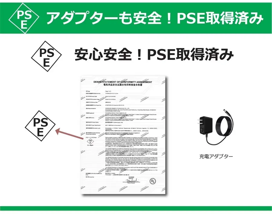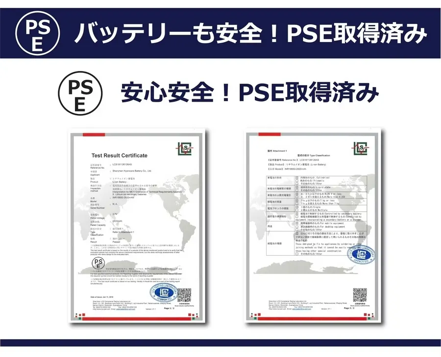 PSEマークは電気用品安全法に基づき、国の定める安全基準の検査に合格して電気製品が安全性を満たしていることを示すマークです。リチウム単電池・組電池は国連(UN)の危険物リストで危険物(Class9)に分類されており、国連勧告の定める試験に合格しなければ輸送が認められません。