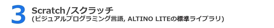 小学生~高校生を対象とする、ブロックプログラミング言語です。スクラッチは、アメリカ・マサチューセッツ工科大学のメディアラボが無償で公開しているビジュアルプログラミング言語で、画面上のブロックをつなぎ合わせてプログラムを作ります。日本語でも使用可能で主にマウスを使用するため、キーボード操作に不慣れな小学生でも利用することができます。ALTINO LITE専用のモジュールが追加されたスクラッチをダウンロードし使用します。
