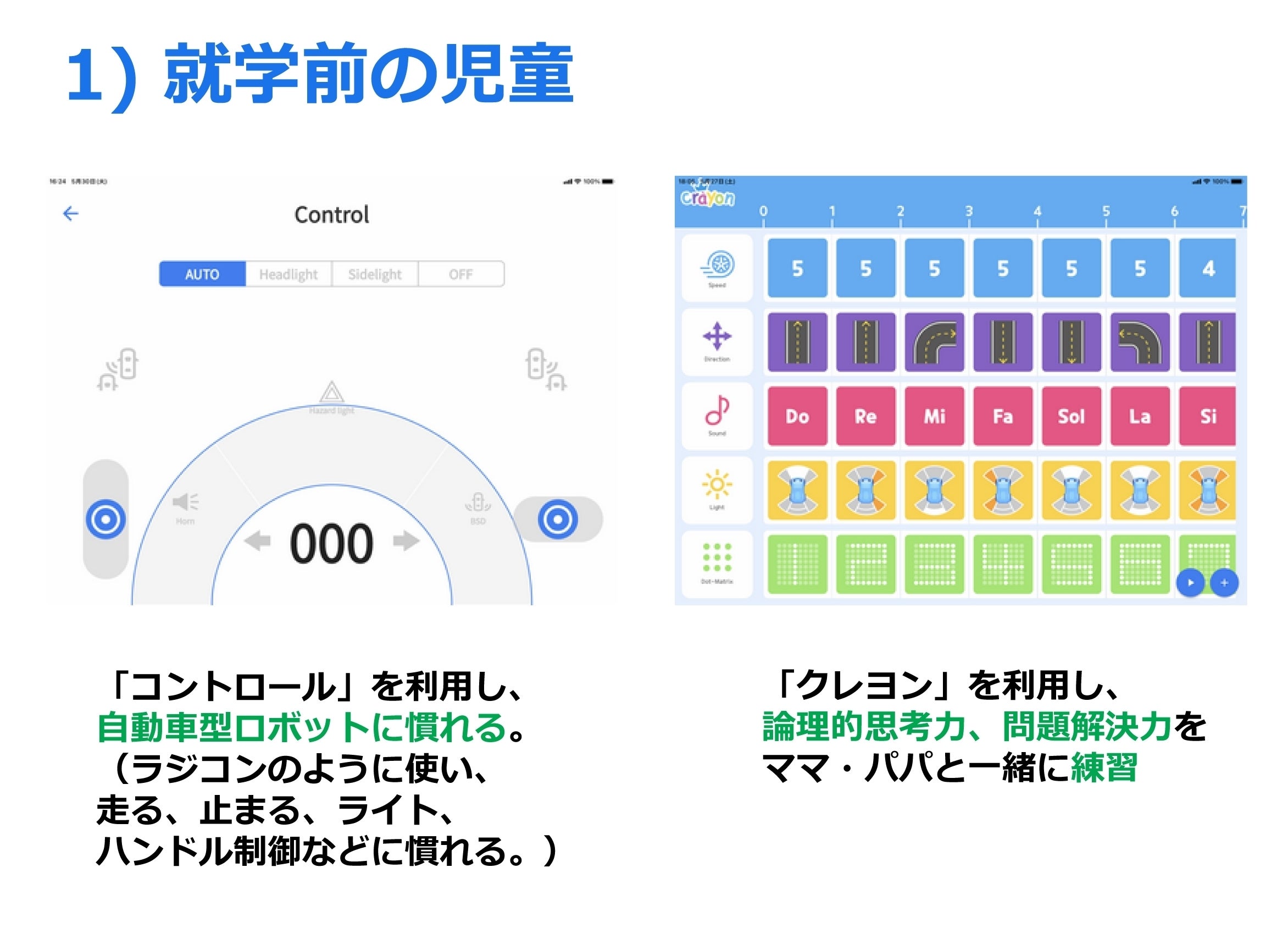 コントロールの機能はラジコンのようにALTINO LITEを制御することができます。自動車型ロボットを玩具のように使用することで抵抗感を和らげ、少し慣れてきたら、クレヨンを活用しコントロールで動かしたALTINO LITEを同じように制御できるように練習をします。練習の際には障害物などを設置しハンドル裁きの練習をしてみましょう。コントロールの機能は「iPhone, iPad, アンドロイド端末」で使用できます。